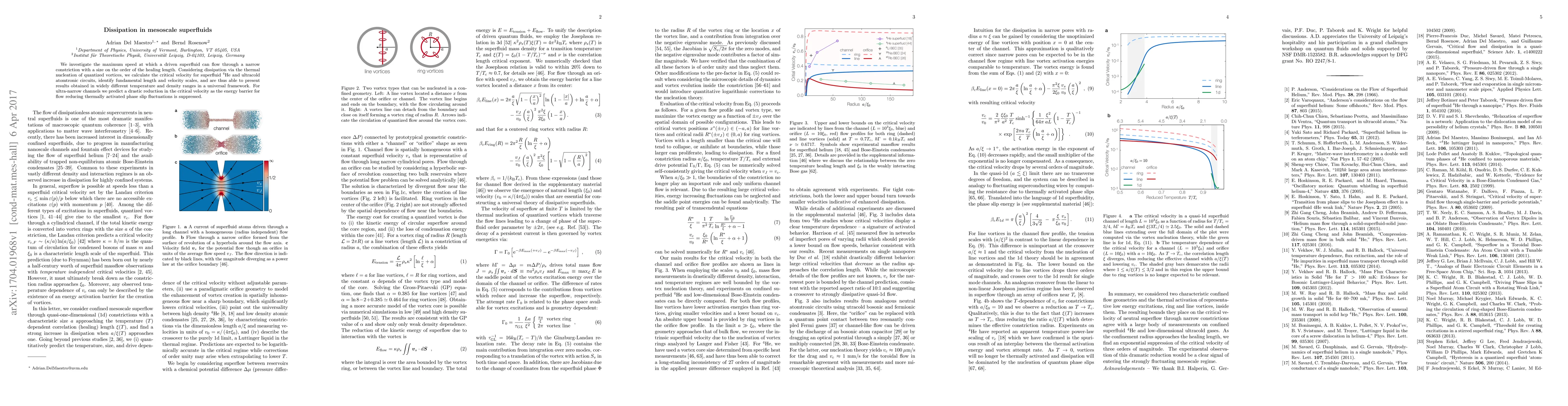We investigate the maximum speed at which a driven superfluid can flow through a narrow constriction with a size on the order of the healing length. Considering dissipation via the thermal nucleation of quantized vortices, we calculate the critical velocity for superfluid $^4$He and ultracold atomtronic circuits, identify fundamental length and velocity scales, and are thus able to present results obtained in widely different temperature and density ranges in a universal framework. For ultra-narrow channels we predict a drastic reduction in the critical velocity as the energy barrier for flow reducing thermally activated phase slip fluctuations is suppressed.