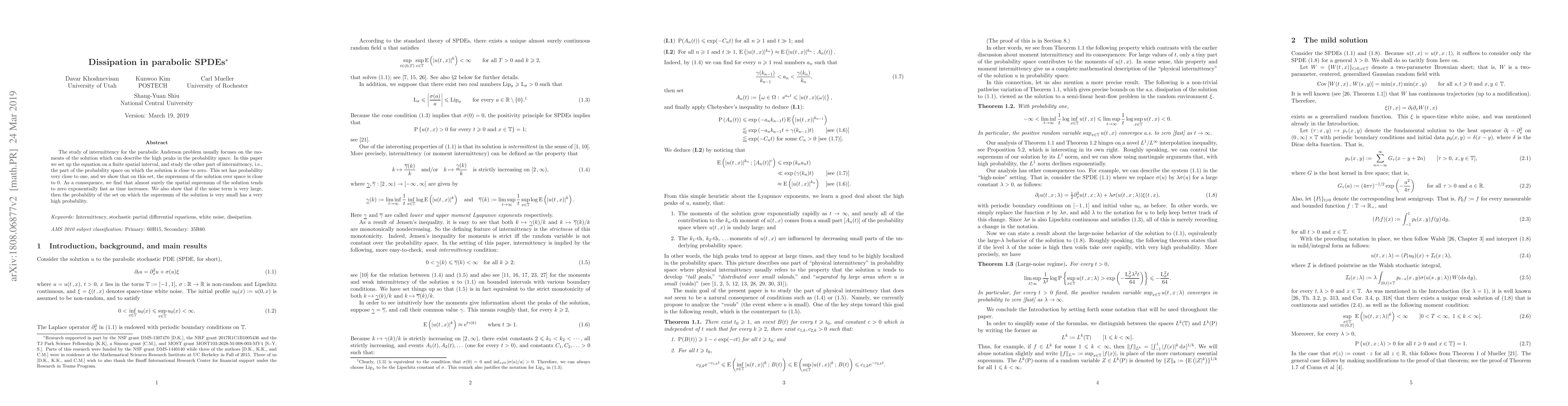 This paper studies the behavior of solutions to parabolic stochastic differential equations (SPDEs) over time, finding that almost surely the spatial supremum of the solution tends to zero exponentially fast as time increases.
