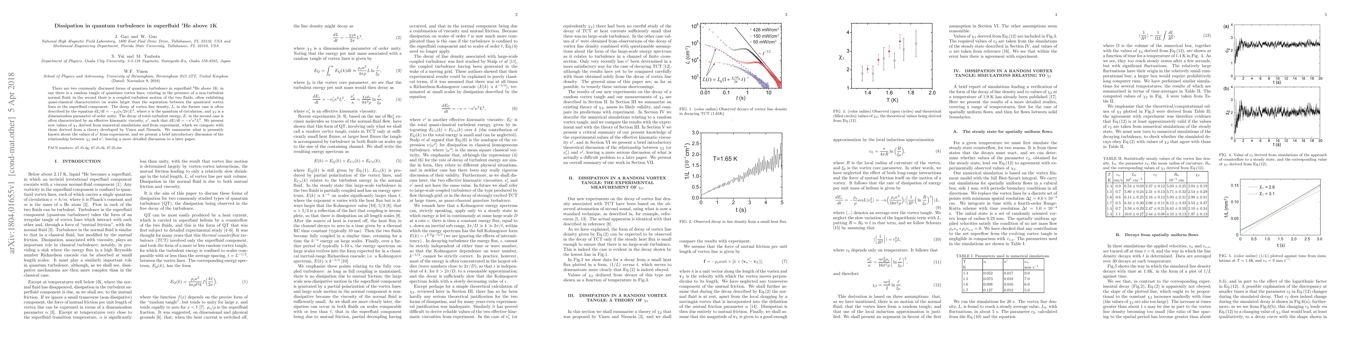 There are two commonly discussed forms of quantum turbulence in superfluid $^4$He above 1K: in one there is a random tangle of quantizes vortex lines, existing in the presence of a non-turbulent normal fluid; in the second there is a coupled turbulent motion of the two fluids, often exhibiting quasi-classical characteristics on scales larger than the separation between the quantized vortex lines in the superfluid component. The decay of vortex line density, $L$, in the former case is often described by the equation $dL/dt=-\chi_2 (\kappa/2\pi)L^2$, where $\kappa$ is the quantum of circulation, and $\chi_2$ is a dimensionless parameter of order unity. The decay of total turbulent energy, $E$, in the second case is often characterized by an effective kinematic viscosity, $\nu'$, such that $dE/dt=-\nu' \kappa^2 L^2$. We present new values of $\chi_2$ derived from numerical simulations and from experiment, which we compare with those derived from a theory developed by Vinen and Niemela. We summarise what is presently known about the values of $\nu'$ from experiment, and we present a brief introductory discussion of the relationship between $\chi_2$ and $\nu'$, leaving a more detailed discussion to a later paper.