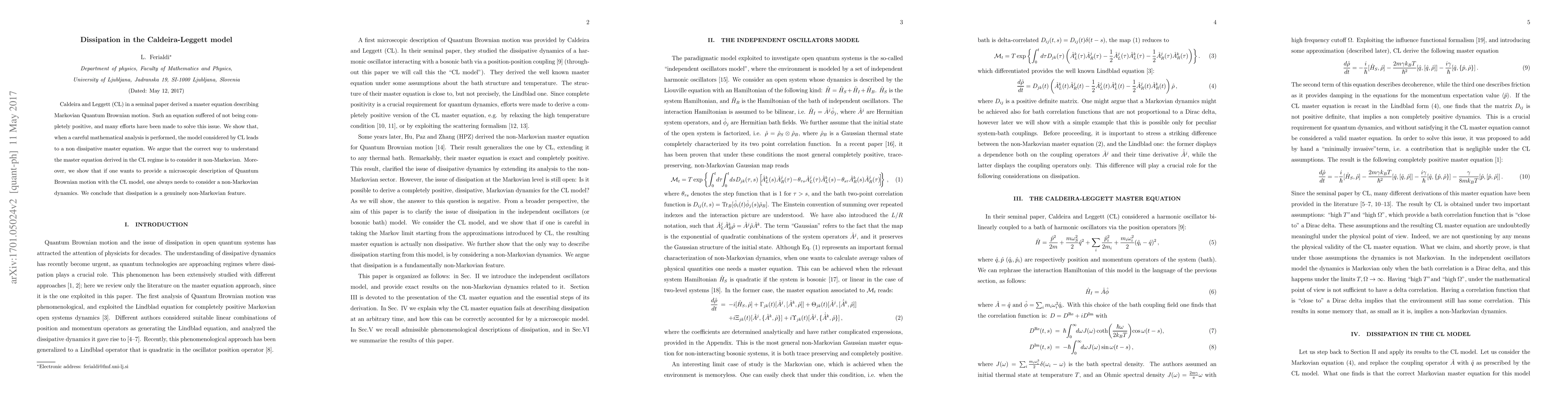 This paper argues that the Caldeira-Leggett model, traditionally used to describe quantum Brownian motion, leads to a non-dissipative master equation when analyzed carefully. The authors conclude that dissipation in the model should be understood as a non-Markovian feature rather than a purely Markovian one.