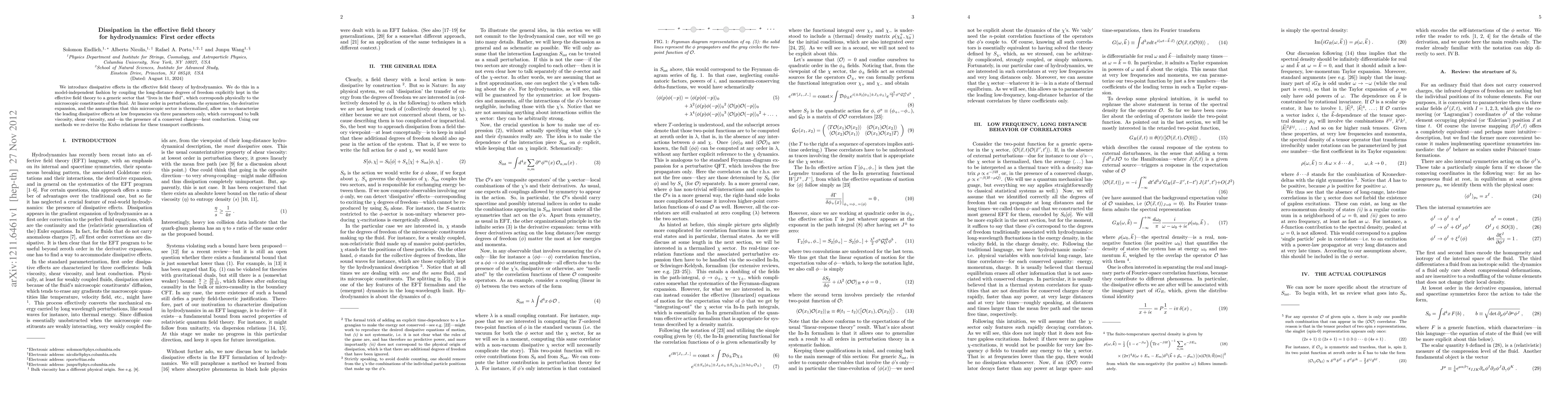 This paper introduces dissipative effects into the effective field theory of hydrodynamics by coupling long-distance degrees of freedom to microscopic fluid constituents. At first-order in perturbations, it characterizes leading low-frequency dissipative effects via three parameters: bulk viscosity, shear viscosity, and heat conduction, and re-derives the Kubo relations for these transport coefficients.