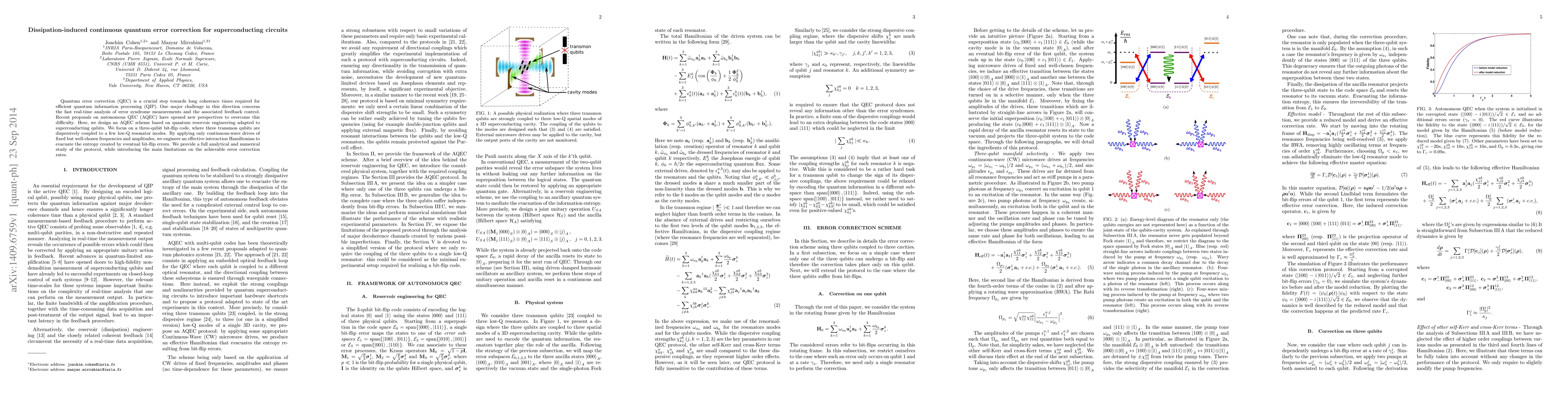 This paper proposes an autonomous quantum error correction (AQEC) scheme for superconducting qubits using quantum reservoir engineering. The scheme employs three transmon qubits coupled to low-Q resonators, continuously driven to dissipate errors via an engineered interaction Hamiltonian, and is analyzed both analytically and numerically.