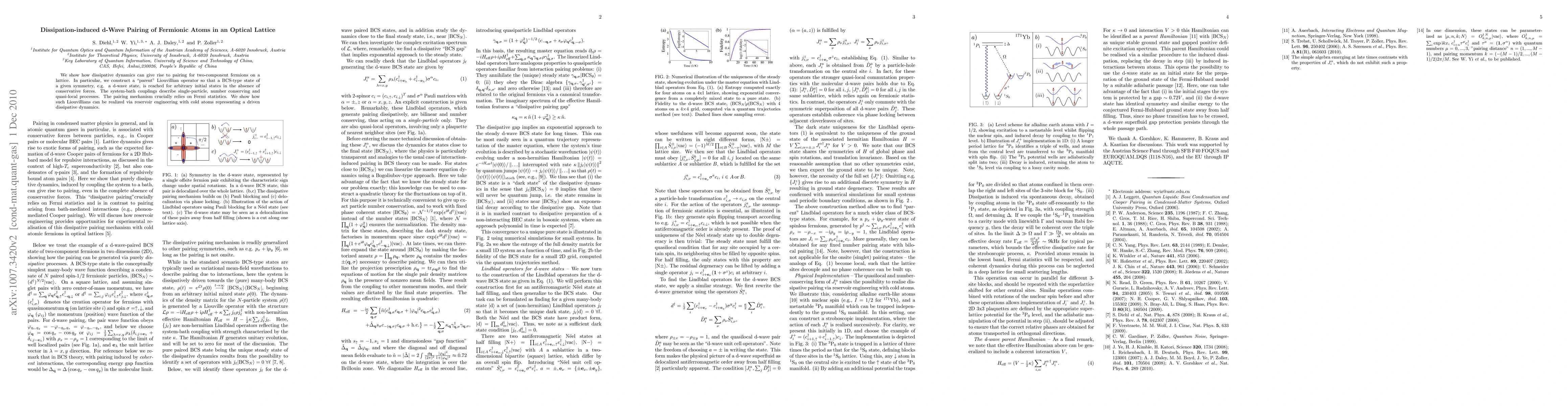 This paper demonstrates how dissipative dynamics can induce d-wave pairing in fermionic atoms within an optical lattice, utilizing a constructed "parent" Liouvillian operator. The pairing mechanism, reliant on Fermi statistics, is achieved through system-bath couplings that describe quasi-local, number-conserving processes, and can be realized via engineered reservoirs in cold atom systems.