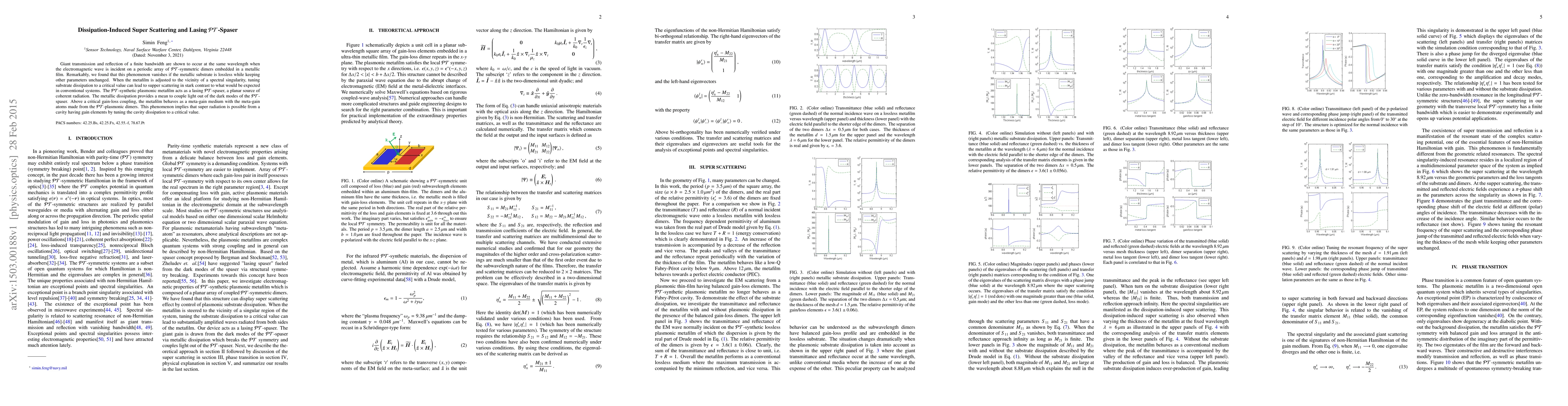Giant transmission and reflection of a finite bandwidth are shown to occur at the same wavelength when the electromagnetic wave is incident on a periodic array of PT-symmetric dimers embedded in a metallic film. Remarkably, we found that this phenomenon vanishes if the metallic substrate is lossless while keeping other parameters unchanged. When the metafilm is adjusted to the vicinity of a spectral singularity, tuning substrate dissipation to a critical value can lead to supper scattering in stark contrast to what would be expected in conventional systems. The PT-synthetic plasmonic metafilm acts as a lasing PT-spaser, a planar source of coherent radiation. The metallic dissipation provides a mean to couple light out of the dark modes of the PT- spaser. Above a critical gain-loss coupling, the metafilm behaves as a meta-gain medium with the meta-gain atoms made from the PT-plasmonic dimers. This phenomenon implies that super radiation is possible from a cavity having gain elements by tuning the cavity dissipation to a critical value.