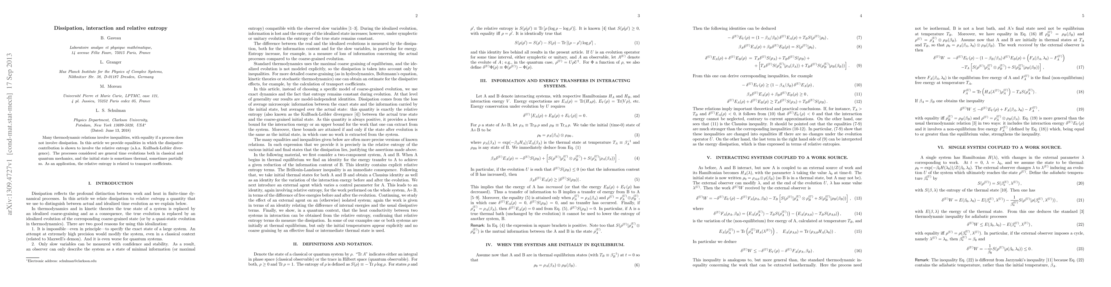 This research establishes equalities in thermodynamic processes, revealing that dissipation's contribution can be expressed via relative entropy (Kullback-Leibler divergence). It applies to both classical and quantum mechanics, linking relative entropy to transport coefficients as an example.
