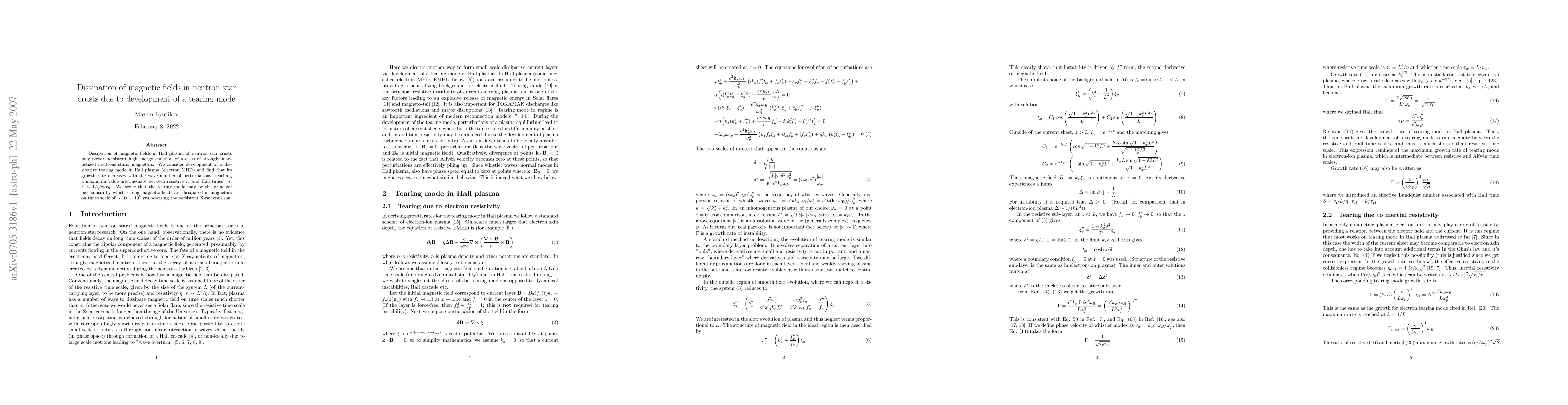 This paper investigates the dissipation of magnetic fields in neutron star crusts via a tearing mode in Hall plasma, suggesting it may power the persistent high-energy emissions of magnetars. The study finds that the growth rate of this mode increases with perturbation wave number, reaching a maximum intermediate between resistive and Hall times, and posits that this mechanism could dissipate strong magnetic fields over timescales of 10^4-10^5 years.