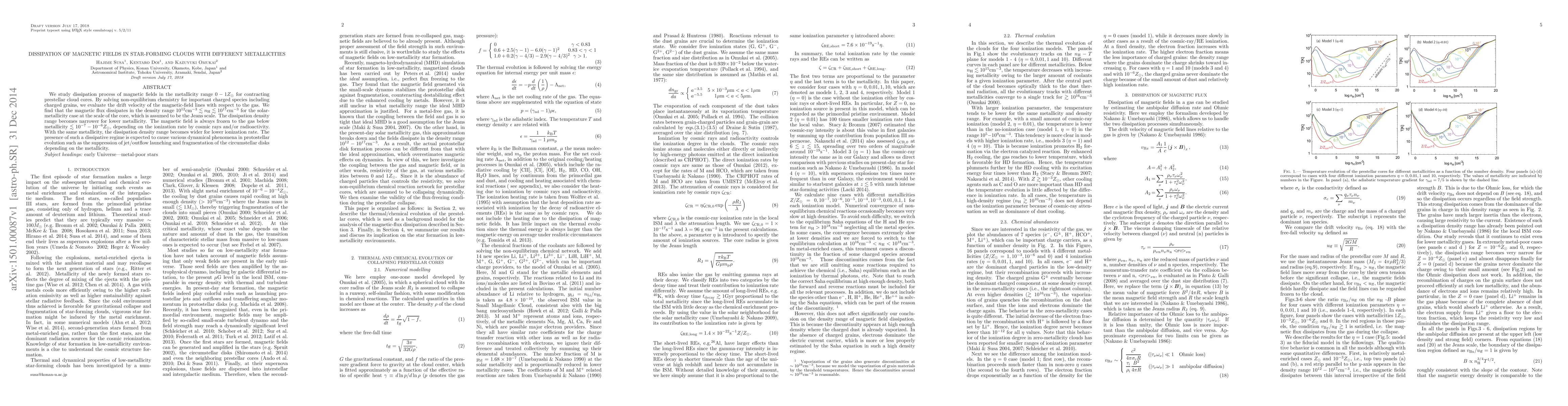 This paper investigates how magnetic field dissipation occurs in star-forming clouds with varying metallicities, finding that magnetic flux dissipates in a specific density range for solar metallicity, while lower metallicity leads to a narrower dissipation range and magnetic fields being frozen to the gas. The study highlights the impact of metallicity on protostellar evolution dynamics.