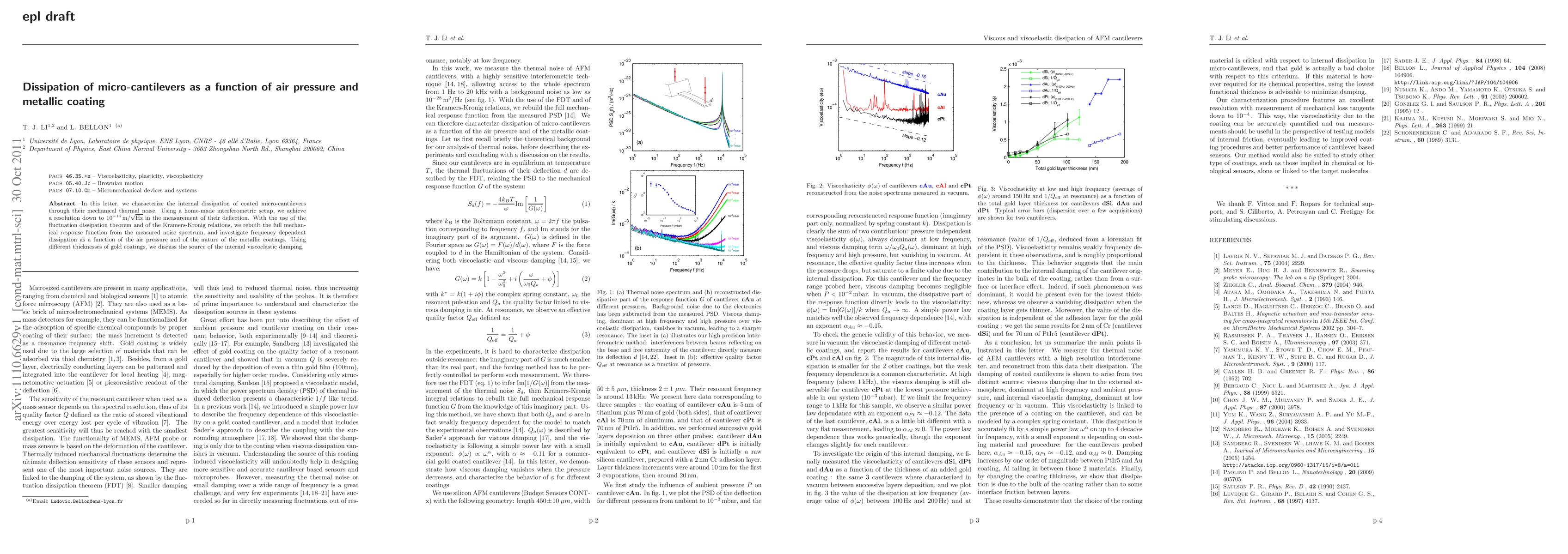 This paper investigates the internal dissipation of metallic-coated micro-cantilevers by measuring their mechanical thermal noise using an interferometric setup. The study reveals frequency-dependent dissipation variations influenced by air pressure and the type of metallic coating, with gold coatings showing specific viscoelastic damping characteristics.