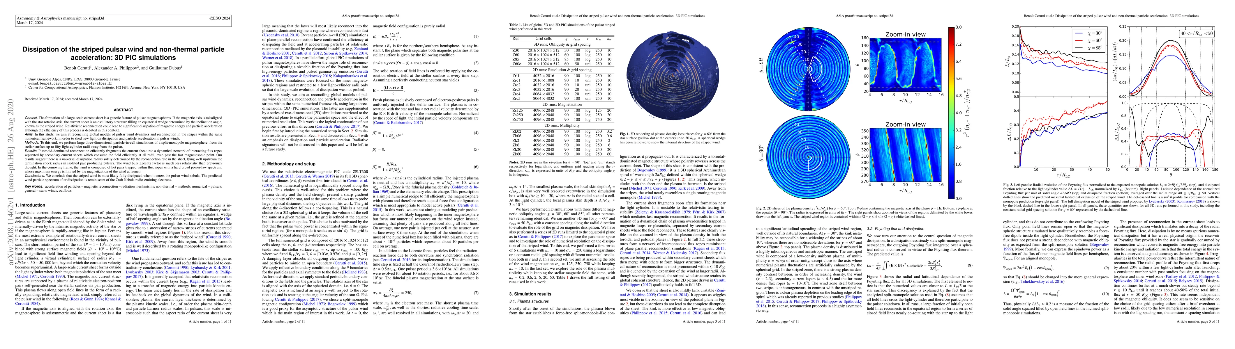 The formation of a large-scale current sheet is a generic feature of pulsar magnetospheres. If the magnetic axis is misaligned with the star rotation axis, the current sheet is an oscillatory structure filling an equatorial wedge determined by the inclination angle, known as the striped wind. Relativistic reconnection could lead to significant dissipation of magnetic energy and particle acceleration although the efficiency of this process is debated in this context. In this study, we aim at reconciling global models of pulsar wind dynamics and reconnection in the stripes within the same numerical framework, in order to shed new light on dissipation and particle acceleration in pulsar winds. To this end, we perform large three-dimensional particle-in-cell simulations of a split-monopole magnetosphere, from the stellar surface up to fifty light-cylinder radii away from the pulsar. Plasmoid-dominated reconnection efficiently fragments the current sheet into a dynamical network of interacting flux ropes separated by secondary current sheets which consume the field efficiently at all radii, even past the fast magnetosonic point. Our results suggest there is a universal dissipation radius solely determined by the reconnection rate in the sheet, lying well upstream the termination shock radius in isolated pair producing pulsars. The wind bulk Lorentz factor is much less relativistic than previously thought. In the comoving frame, the wind is composed of hot pairs trapped within flux ropes with a hard broad power-law spectrum, whose maximum energy is limited by the magnetization of the wind at launch. We conclude that the striped wind is most likely fully dissipated when it enters the pulsar wind nebula. The predicted wind particle spectrum after dissipation is reminiscent of the Crab Nebula radio-emitting electrons.