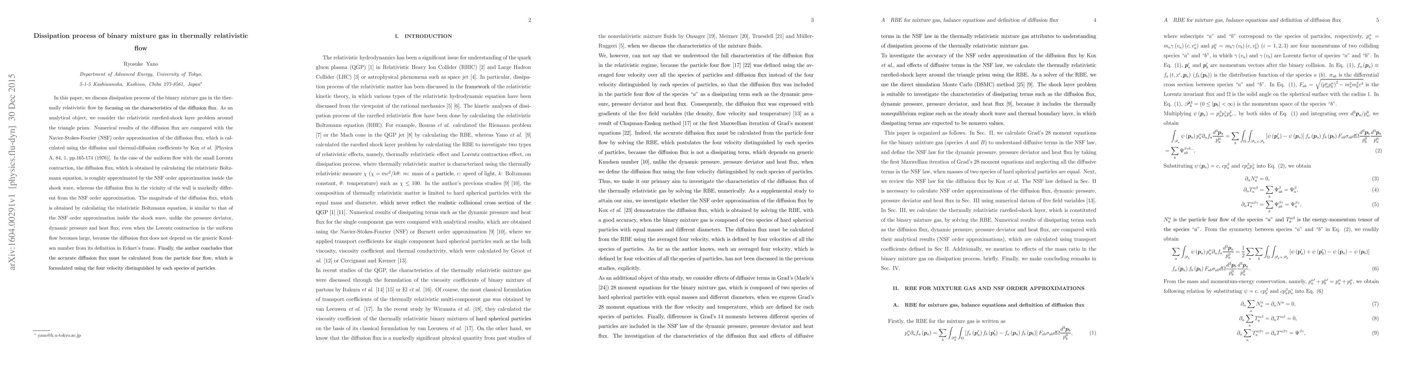 This paper examines the dissipation process of binary mixture gases in thermally relativistic flow, focusing on diffusion flux characteristics. Using the relativistic rarefied-shock layer problem around a triangle prism, numerical results show that while diffusion flux approximates Navier-Stokes-Fourier order inside shock waves in uniform flow with small Lorentz contraction, it differs significantly near walls. Despite large Lorentz contraction, diffusion flux magnitude remains similar to NSF order, unlike other pressures and fluxes. The study concludes that accurate diffusion flux calculation requires particle four flow formulation using species-distinguished four velocity.
