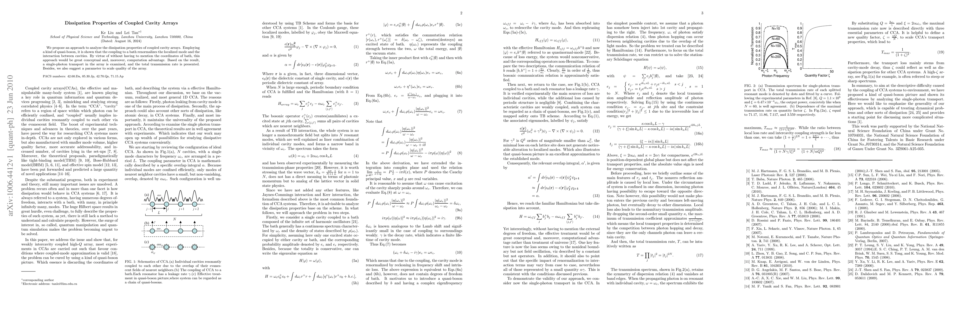 This paper proposes an analytical method to study dissipation in coupled cavity arrays using quasi-bosons, demonstrating how coupling to a bath affects localized modes and cavity interactions. The approach offers conceptual and computational advantages by avoiding explicit bath coordinates, and it examines single-photon transport and introduces a parameter to assess array quality.