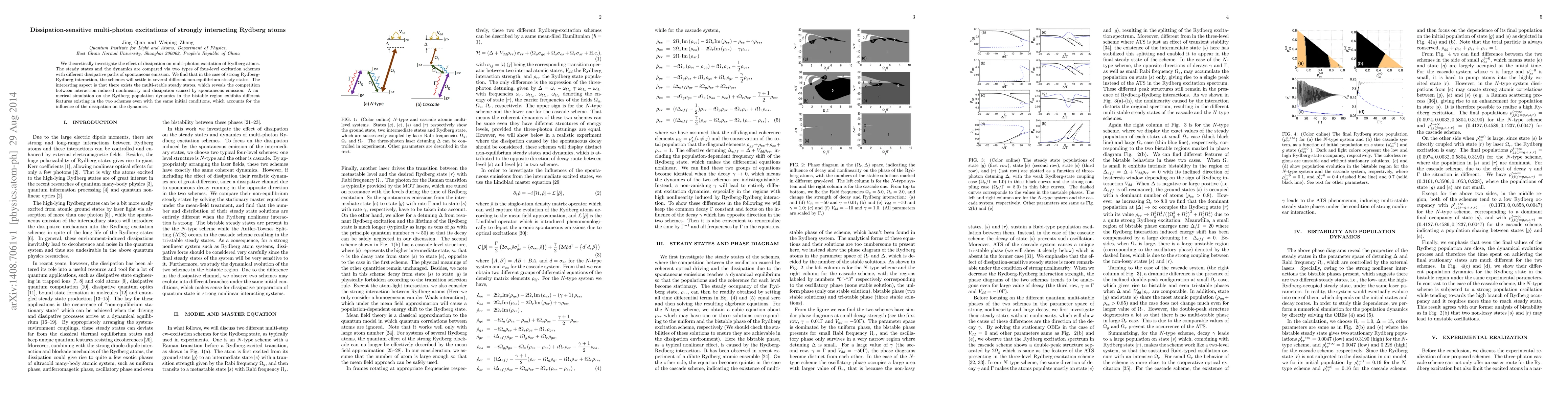 We theoretically investigate the effect of dissipation on multi-photon excitation of Rydberg atoms. The steady states and the dynamics are compared via two types of four-level excitation schemes with different dissipative paths of spontaneous emission. We find that in the case of strong Rydberg-Rydberg interaction, the schemes will settle in several different non-equilibrium steady states. The interesting aspect is that there exists the multi-stable steady states, which reveals the competition between interaction-induced nonlinearity and dissipation caused by spontaneous emission. A numerical simulation on the Rydberg population dynamics in the bistable region exhibits different features existing in the two schemes even with the same initial conditions, which accounts for the influence of the dissipation on the dynamics.