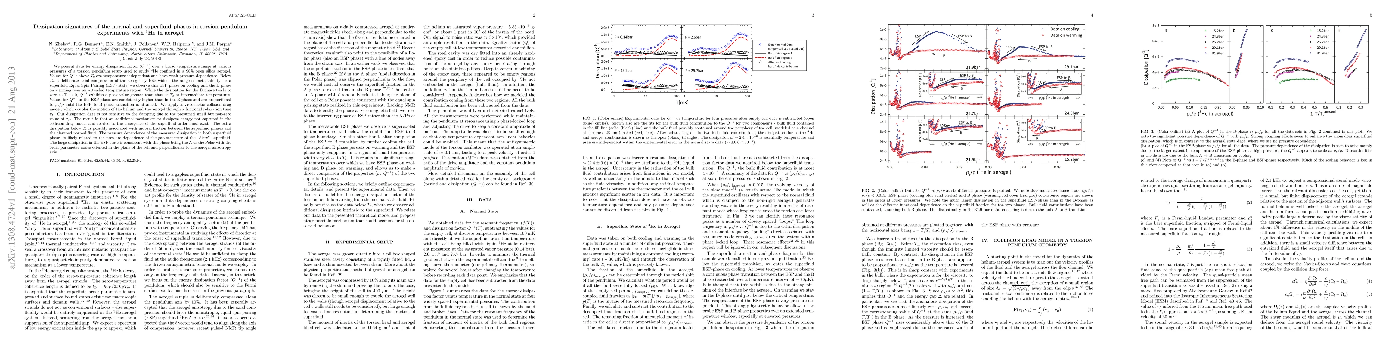 We present data for energy dissipation factor (Q^{-1}) over a broad temperature range at various pressures of a torsion pendulum setup used to study 3He confined in a 98% open silica aerogel. Values for Q^{-1} above T_c are temperature independent and have a weak pressure dependence. Below T_c, a deliberate axial compression of the aerogel by 10% widens the range of metastability for a superfluid Equal Spin Pairing (ESP) state; we observe this ESP phase on cooling and the B phase on warming over an extended temperature region. While the dissipation for the B phase tends to zero as T goes to 0, Q^{-1} exhibits a peak value greater than that at T_c at intermediate temperatures. Values for Q^{-1} in the ESP phase are consistently higher than in the B phase and are proportional to \rho_s/\rho until the ESP to B phase transition is attained. We apply a viscoelastic collision-drag model, which couples the motion of the helium and the aerogel through a frictional relaxation time \tau_f. Our dissipation data is not sensitive to the damping due to the presumed small but non-zero value of \tau_f. The result is that an additional mechanism to dissipate energy not captured in the collision-drag model and related to the emergence of the superfluid order must exist. The extra dissipation below T_c is possibly associated with mutual friction between the superfluid phases and the clamped normal fluid. The pressure dependence of the measured dissipation in both superfluid phases is likely related to the pressure dependence of the gap structure of the "dirty" superfluid. The large dissipation in the ESP state is consistent with the phase being the A or the Polar with the order parameter nodes oriented in the plane of the cell and perpendicular to the aerogel anisotropy axis.