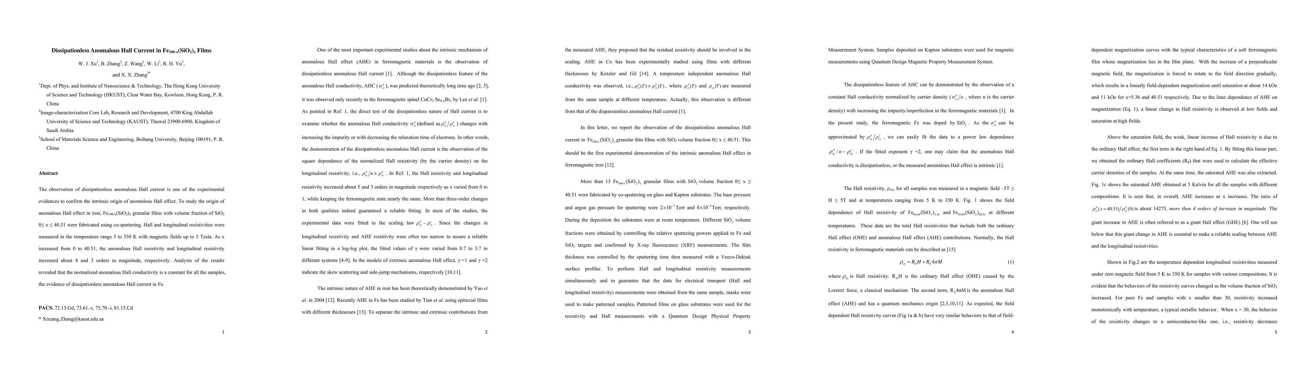This study investigates the intrinsic origin of the anomalous Hall effect in iron-silicate granular films using co-sputtering. The research finds that the normalized anomalous Hall conductivity remains constant across samples, confirming the dissipationless anomalous Hall current in Fe$_{100-x}$(SiO$_{2}$)$_{x}$.
