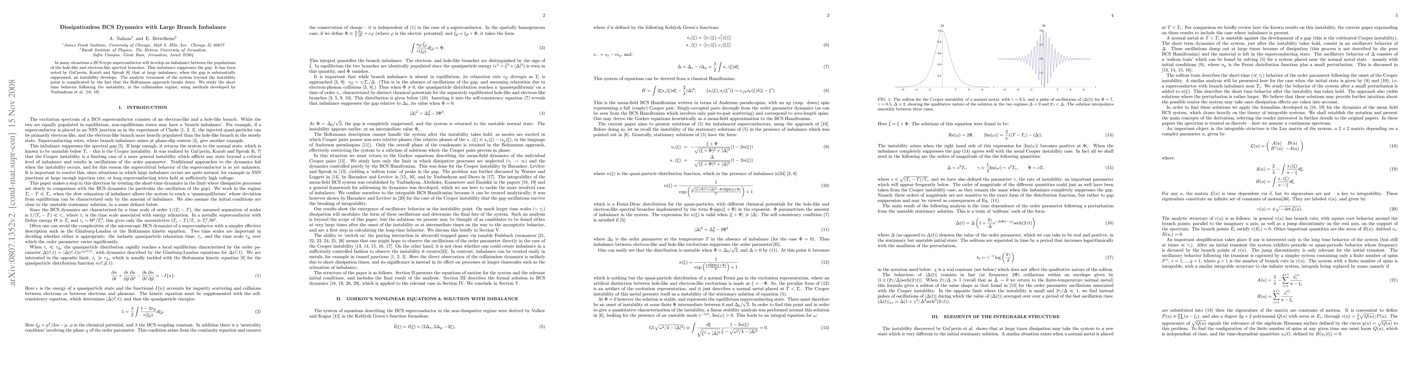This paper investigates the dynamics of BCS superconductors with large branch imbalances, where the imbalance suppresses the energy gap. It explores the short-time behavior post-instability in the collisionless regime, employing advanced analytical methods to overcome the breakdown of the Boltzmann approach.
