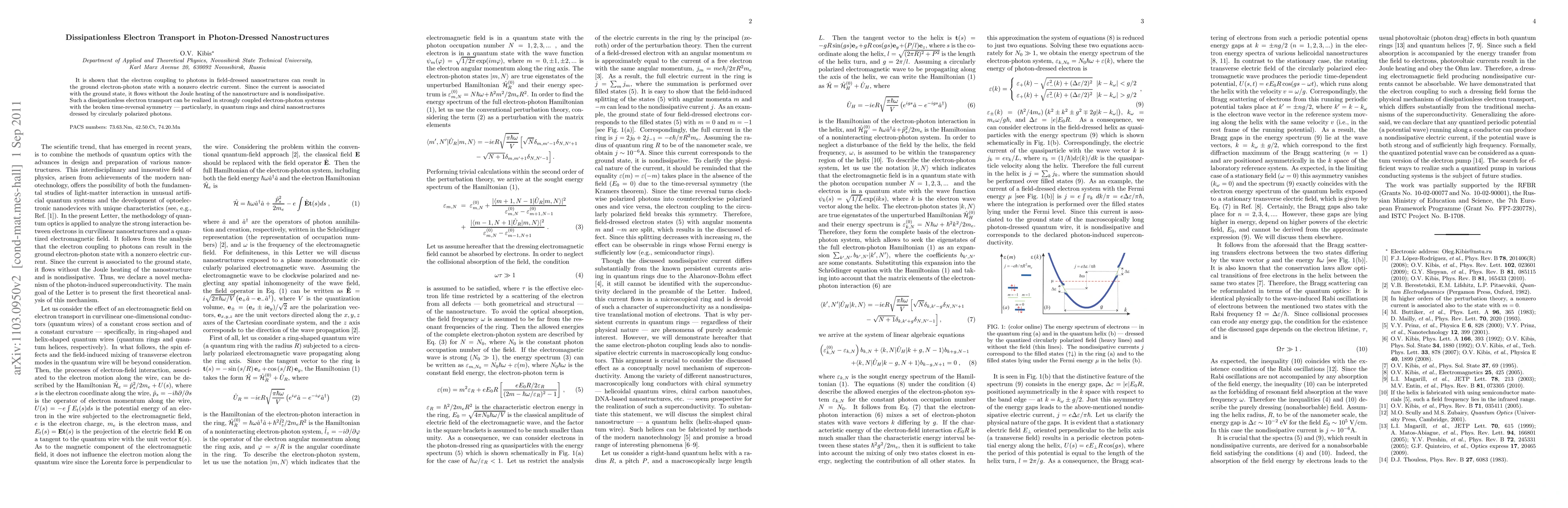 This paper demonstrates that electron coupling to photons in field-dressed nanostructures can create a ground state with nonzero electric current, resulting in dissipationless electron transport without Joule heating, particularly in quantum rings and chiral nanostructures with circularly polarized photons.