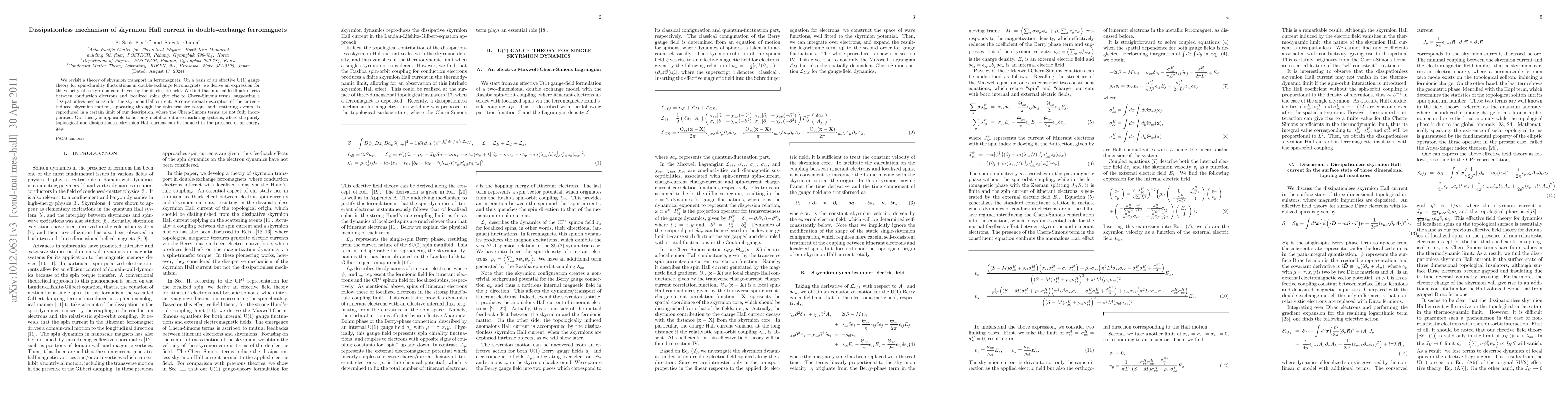 We revisit a theory of skyrmion transport in ferromagnets. On a basis of an effective U(1) gauge theory for spin-chirality fluctuations in double-exchange ferromagnets, we derive an expression for the velocity of a skyrmion core driven by the dc electric field. We find that mutual feedback effects between conduction electrons and localized spins give rise to Chern-Simons terms, suggesting a dissipationless mechanism for the skyrmion Hall current. A conventional description of the current-induced skyrmion motion, appearing through the spin transfer torque and scattering events, is reproduced in a certain limit of our description, where the Chern-Simons terms are not fully incorporated. Our theory is applicable to not only metallic but also insulating systems, where the purely topological and dissipationless skyrmion Hall current can be induced in the presence of an energy gap.