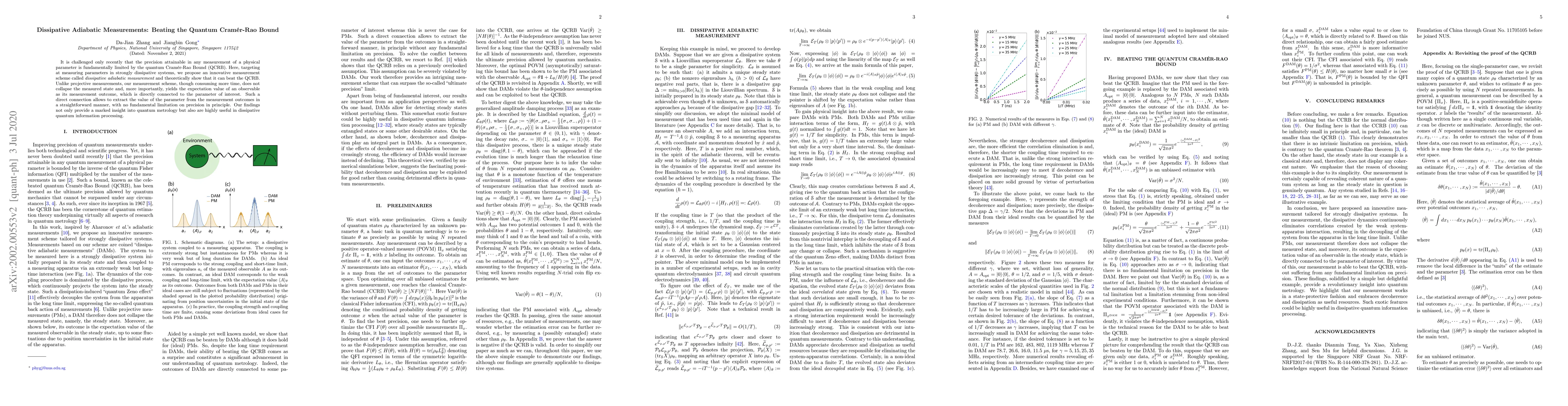 This paper proposes a novel "dissipative adiabatic measurement" technique that can surpass the quantum Cramér-Rao Bound, offering higher precision in measuring parameters in strongly dissipative systems. Unlike traditional projective measurements, this method allows for direct extraction of parameter values without fundamental precision limitations.