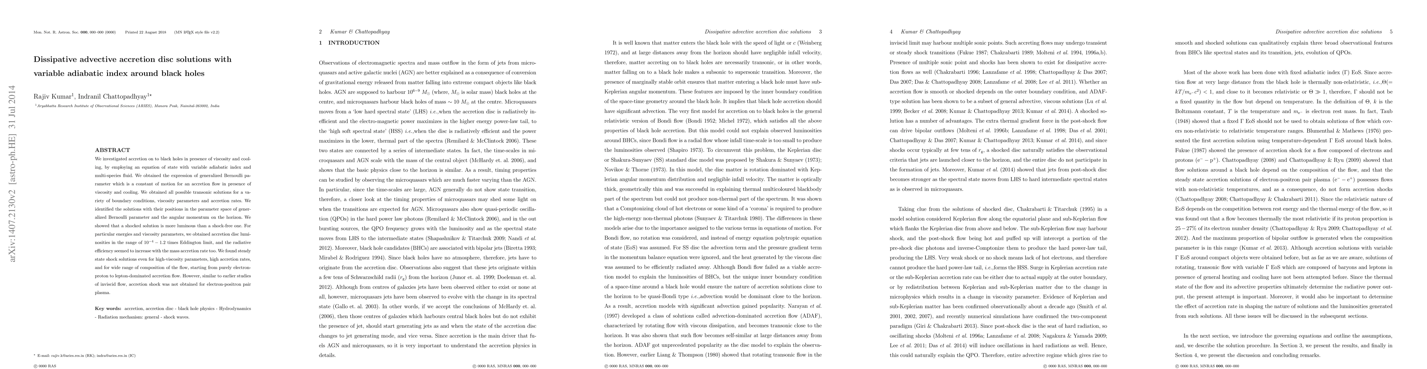 We investigated accretion on to black holes in presence of viscosity and cooling, by employing an equation of state with variable adiabatic index and multi-species fluid. We obtained the expression of generalized Bernoulli parameter which is a constant of motion for an accretion flow in presence of viscosity and cooling. We obtained all possible transonic solutions for a variety of boundary conditions, viscosity parameters and accretion rates. We identified the solutions with their positions in the parameter space of generalized Bernoulli parameter and the angular momentum on the horizon. We showed that a shocked solution is more luminous than a shock-free one. For particular energies and viscosity parameters, we obtained accretion disc luminosities in the range of $10^{-4}-1.2$ times Eddington limit, and the radiative efficiency seemed to increase with the mass accretion rate too. We found steady state shock solutions even for high-viscosity parameters, high accretion rates, and for wide range of composition of the flow, starting from purely electron-proton to lepton-dominated accretion flow. However, similar to earlier studies of inviscid flow, accretion shock was not obtained for electron-positron pair plasma.