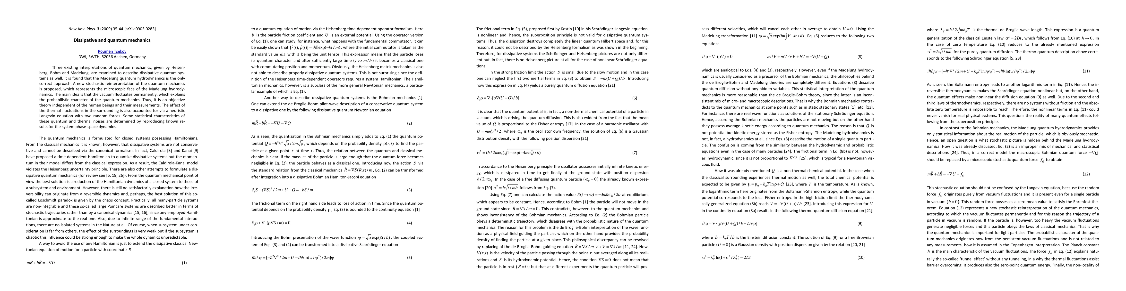 This paper examines three interpretations of quantum mechanics to describe dissipative systems, concluding that Madelung quantum hydrodynamics is the only correct approach. It proposes a new stochastic reinterpretation of quantum mechanics, suggesting that vacuum fluctuations explain its probabilistic nature, and introduces a Langevin equation to account for thermal fluctuations.