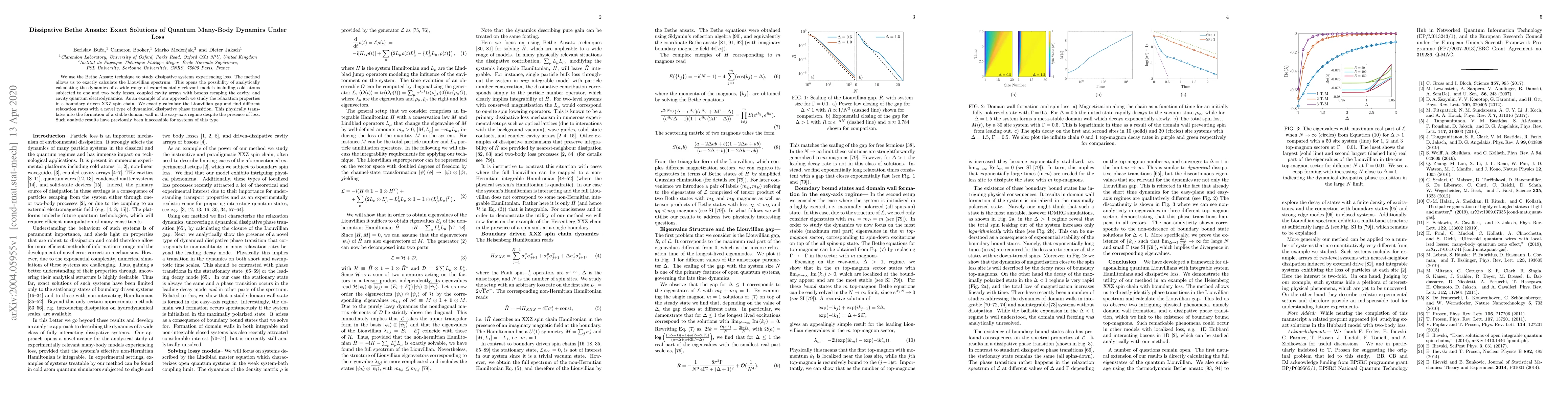 We use the Bethe Ansatz technique to study dissipative systems experiencing loss. The method allows us to exactly calculate the Liouvillian spectrum. This opens the possibility of analytically calculating the dynamics of a wide range of experimentally relevant models including cold atoms subjected to one and two body losses, coupled cavity arrays with bosons escaping the cavity, and cavity quantum electrodynamics. As an example of our approach we study the relaxation properties in a boundary driven XXZ spin chain. We exactly calculate the Liouvillian gap and find different relaxation rates with a novel type of dynamical dissipative phase transition. This physically translates into the formation of a stable domain wall in the easy-axis regime despite the presence of loss. Such analytic results have previously been inaccessible for systems of this type.