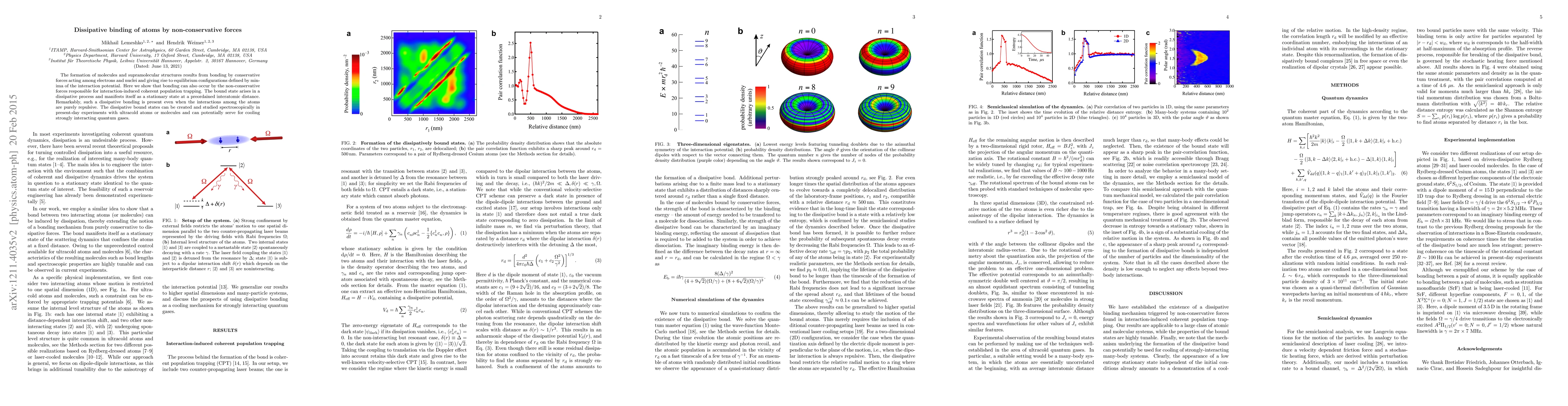 This paper demonstrates that non-conservative forces can create dissipative bound states between atoms, leading to stable configurations even under repulsive interactions, which can be explored in ultracold atom experiments and may aid in cooling quantum gases.