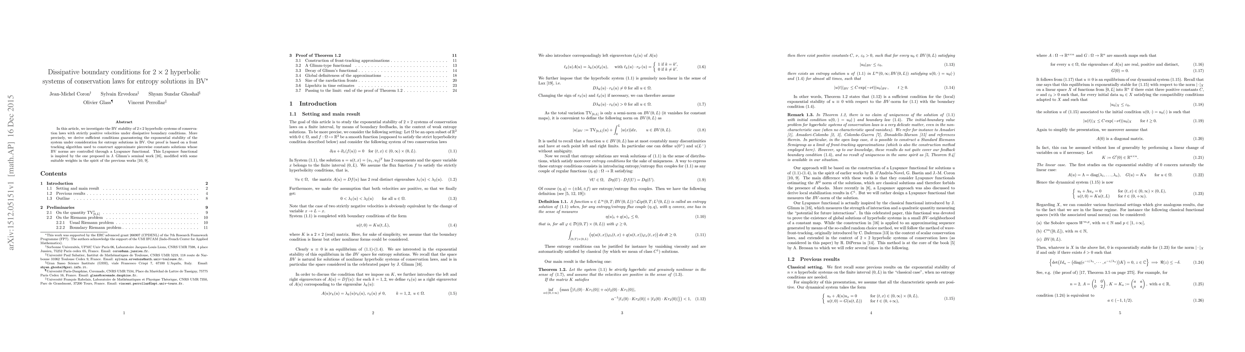 This paper investigates the stability of 2x2 hyperbolic systems of conservation laws with dissipative boundary conditions for entropy solutions in BV. It derives sufficient conditions for exponential stability through a Lyapunov functional and front tracking algorithm.