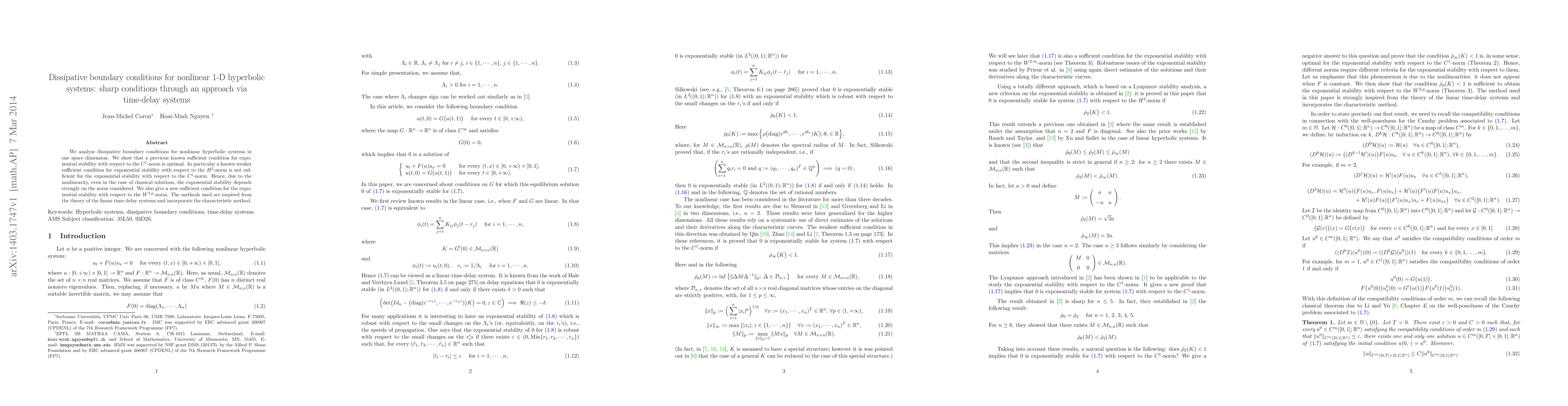 This paper analyzes dissipative boundary conditions for nonlinear 1-D hyperbolic systems, proving that a previously known sufficient condition for exponential stability in the C^1-norm is optimal. It also introduces a new sufficient condition for stability in the W^{2,p}-norm, showing that weaker conditions for H^2-norm stability do not suffice for C^1-norm stability due to nonlinearity effects.