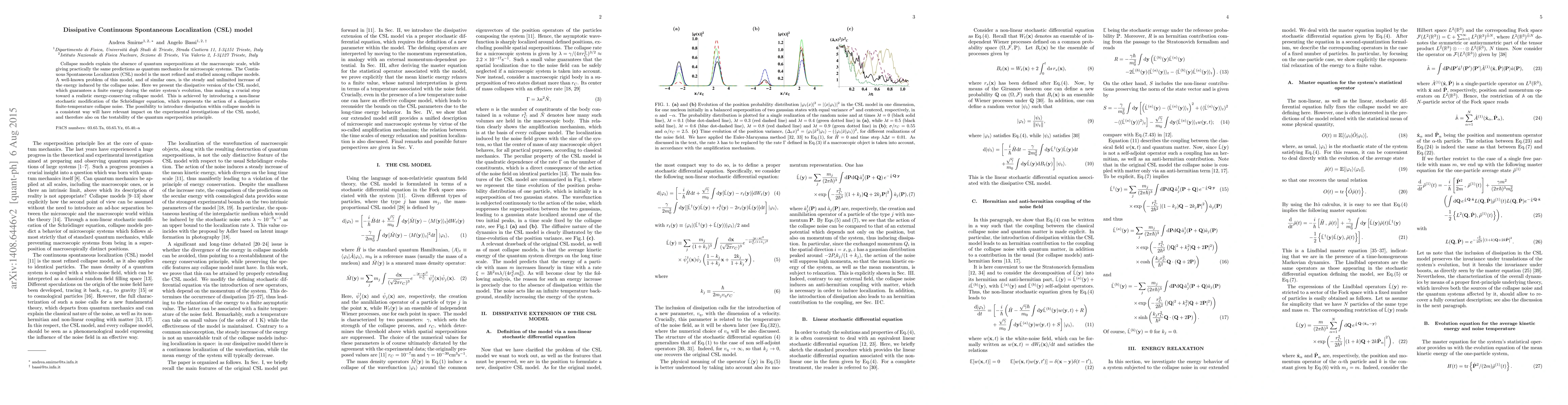 The dissipative Continuous Spontaneous Localization (CSL) model addresses the energy increase issue in collapse models by introducing a finite-temperature dissipative noise, ensuring energy conservation and enhancing the model's testability for experimental investigations. This modification aims to reconcile quantum mechanics with the absence of quantum superpositions at macroscopic scales.