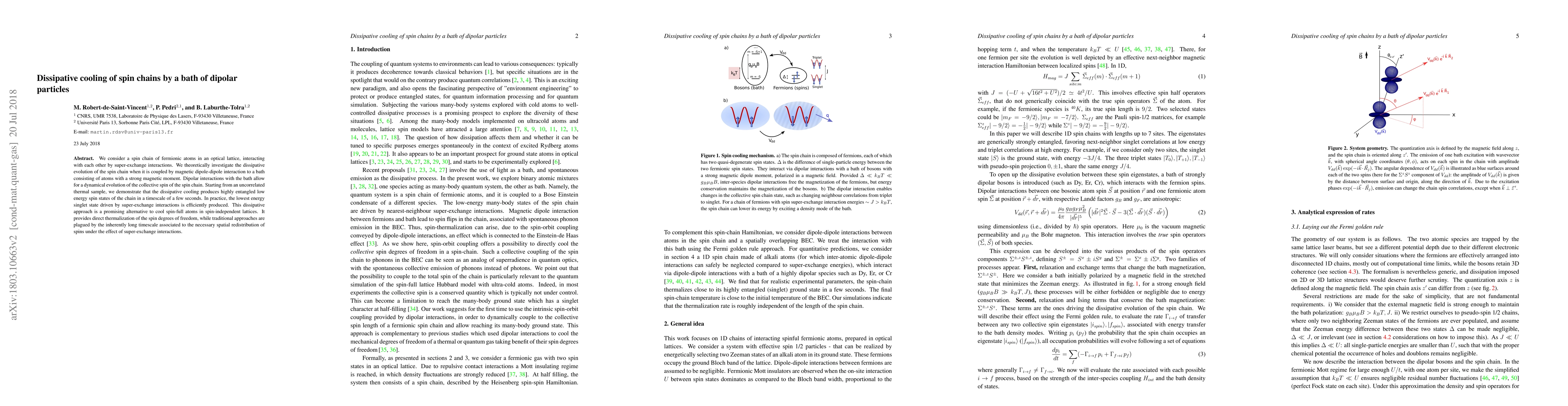 A spin chain of fermionic atoms is cooled using a bath of dipolar particles, producing highly entangled low energy states in a few seconds. This dissipative approach provides an alternative to cooling in spin-independent lattices.