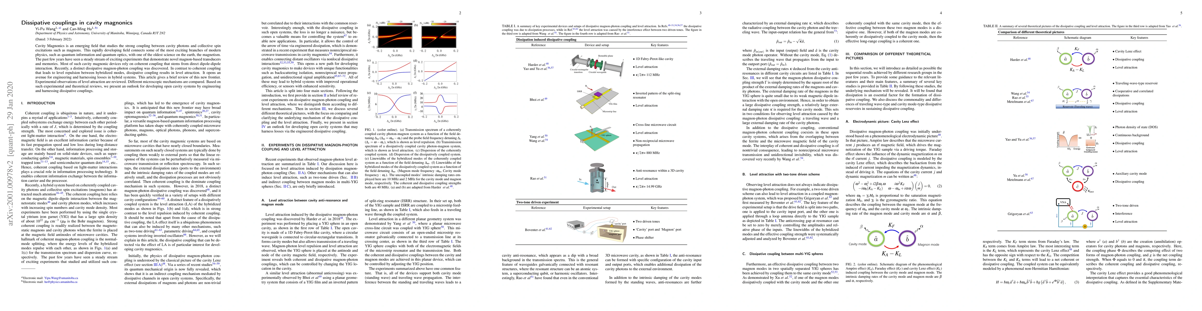 This paper reviews the emerging field of cavity magnonics, focusing on the novel dissipative magnon-photon coupling that contrasts with the coherent coupling typically observed. It highlights experimental observations of level attraction due to dissipative coupling and discusses various microscopic mechanisms, providing an outlook for future open cavity systems engineering.