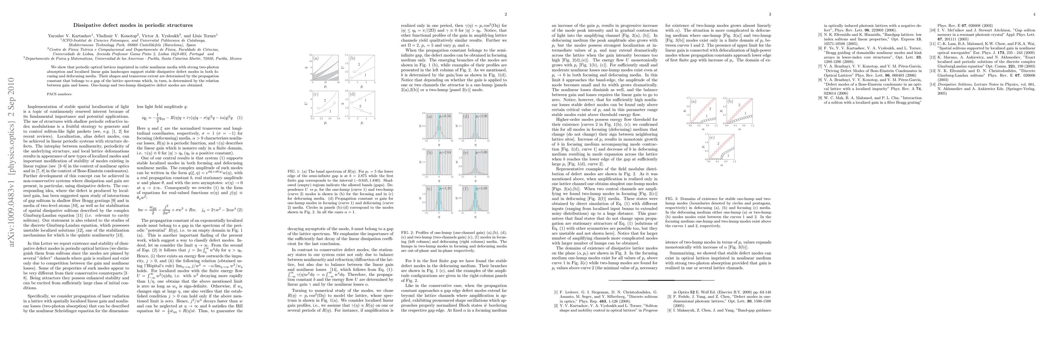 This paper demonstrates that periodic optical lattices in cubic nonlinear media with strong two-photon absorption and localized gain can support stable dissipative defect modes. The modes' shapes and extent are governed by the lattice's gap propagation constant, influenced by the balance between gain and losses.