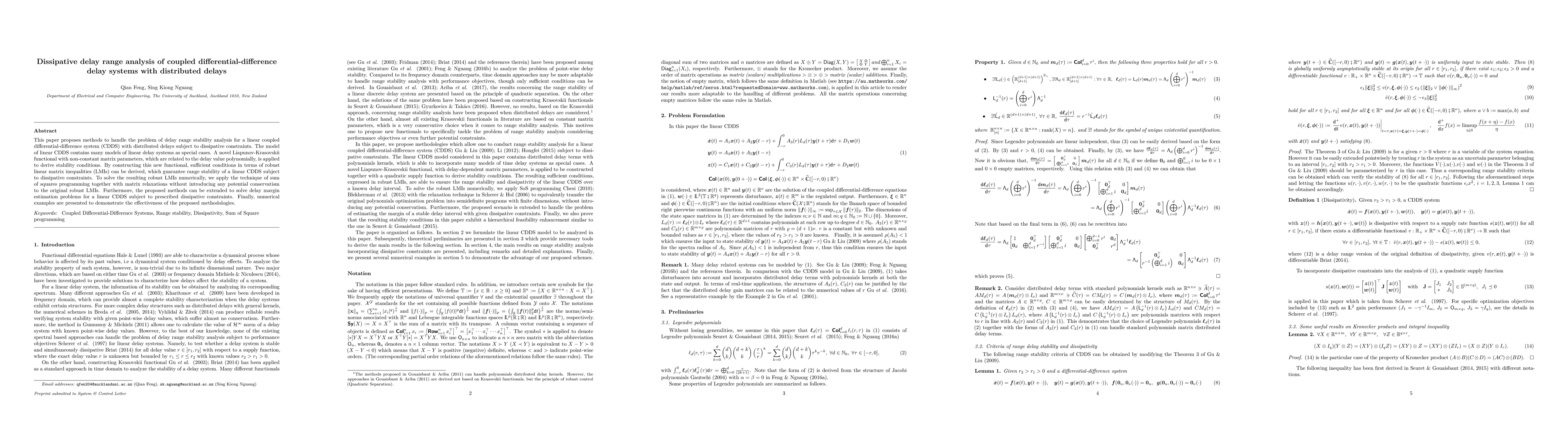 This paper proposes methods to handle the problem of delay range stability analysis for a linear coupled differential-difference system (CDDS) with distributed delays subject to dissipative constraints. The model of linear CDDS contains many models of linear delay systems as special cases. A novel Liapunov-Krasovskii functional with non-constant matrix parameters, which are related to the delay value polynomially, is applied to derive stability conditions. By constructing this new functional, sufficient conditions in terms of robust linear matrix inequalities (LMIs) can be derived, which guarantee range stability of a linear CDDS subject to dissipative constraints. To solve the resulting robust LMIs numerically, we apply the technique of sum of squares programming together with matrix relaxations without introducing any potential conservatism to the original robust LMIs. Furthermore, the proposed methods can be extended to solve delay margin estimation problems for a linear CDDS subject to prescribed dissipative constraints. Finally, numerical examples are presented to demonstrate the effectiveness of the proposed methodologies.