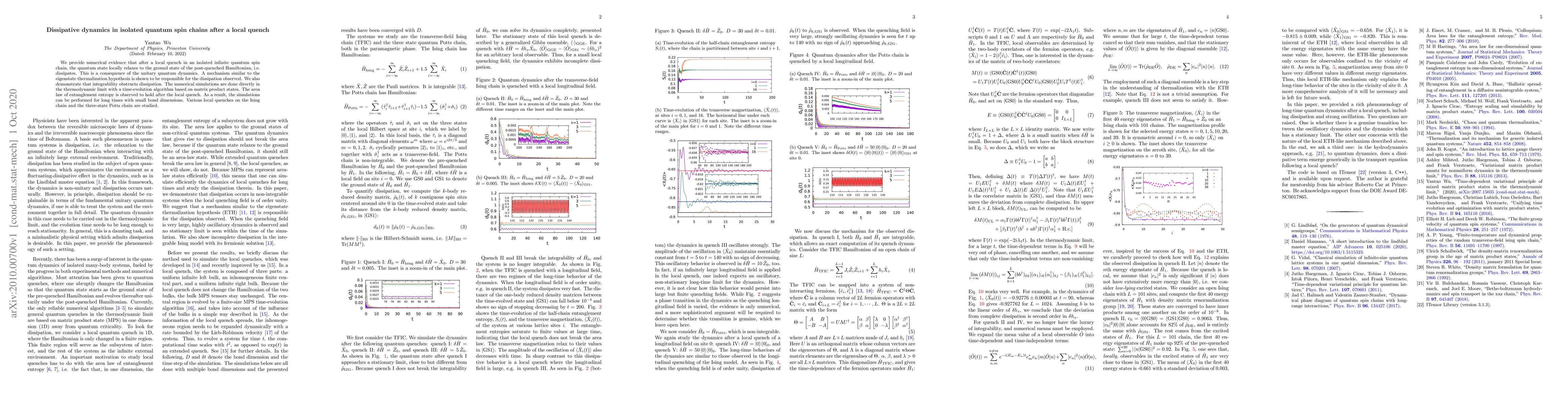 We provide numerical evidence that after a local quench in an isolated infinite quantum spin chain, the quantum state locally relaxes to the ground state of the post-quenched Hamiltonian, i.e. dissipates. This is a consequence of the unitary quantum dynamics. A mechanism similar to the eigenstate thermalization hypothesis is shown to be responsible for the dissipation observed. We also demonstrate that integrability obstructs dissipation. The numerical simulations are done directly in the thermodynamic limit with a time-evolution algorithm based on matrix product states. The area law of entanglement entropy is observed to hold after the local quench. As a result, the simulations can be performed for long times with small bond dimensions. Various local quenches on the Ising chain and the three-state Potts chain are studied.