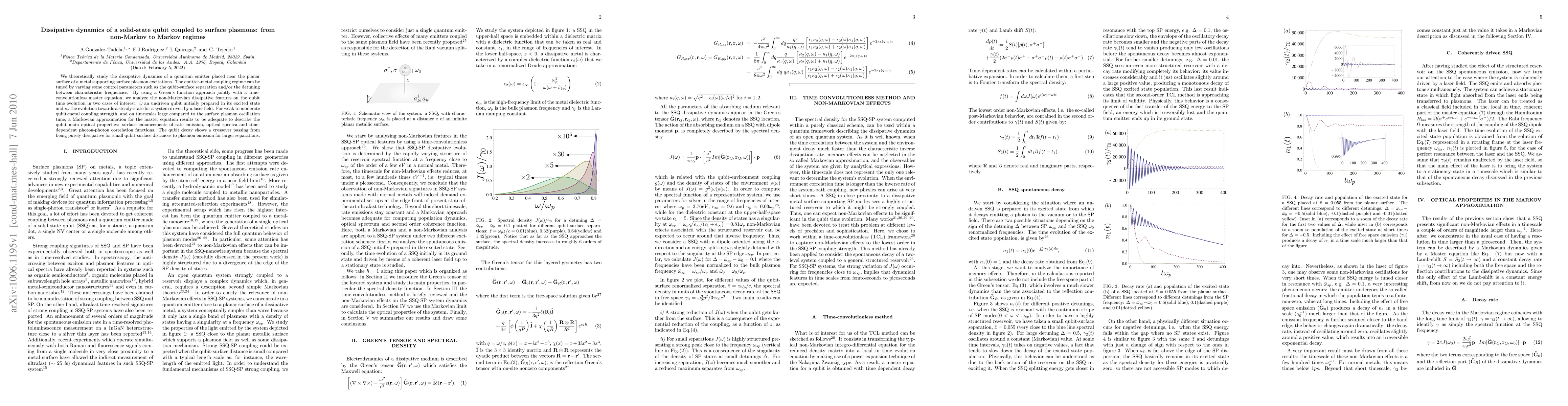 This paper investigates the dissipative dynamics of a solid-state qubit near a metal surface supporting surface plasmons, analyzing both non-Markovian and Markovian regimes. It finds that for moderate coupling and large timescales, the Markovian approximation adequately describes the qubit's optical properties, with decay transitioning from purely dissipative to plasmon emission with increasing qubit-surface separation.