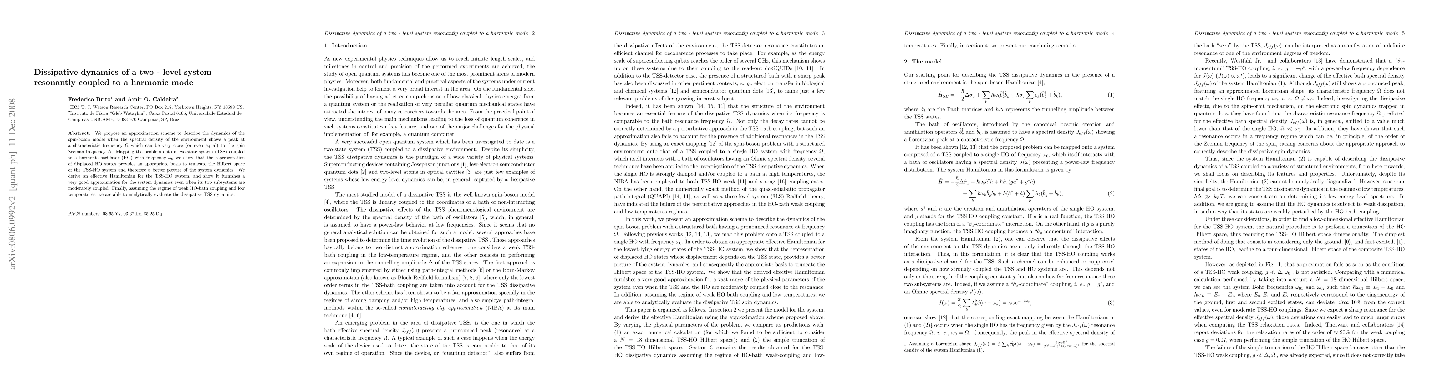 We propose an approximation scheme to describe the dynamics of the spin-boson model when the spectral density of the environment shows a peak at a characteristic frequency $\Omega$ which can be very close (or even equal) to the spin Zeeman frequency $\Delta$. Mapping the problem onto a two-state system (TSS) coupled to a harmonic oscillator (HO) with frequency $\omega_0$ we show that the representation of displaced HO states provides an appropriate basis to truncate the Hilbert space of the TSS-HO system and therefore a better picture of the system dynamics. We derive an effective Hamiltonian for the TSS-HO system, and show it furnishes a very good approximation for the system dynamics even when its two subsystems are moderately coupled. Finally, assuming the regime of weak HO-bath coupling and low temperatures, we are able to analytically evaluate the dissipative TSS dynamics.