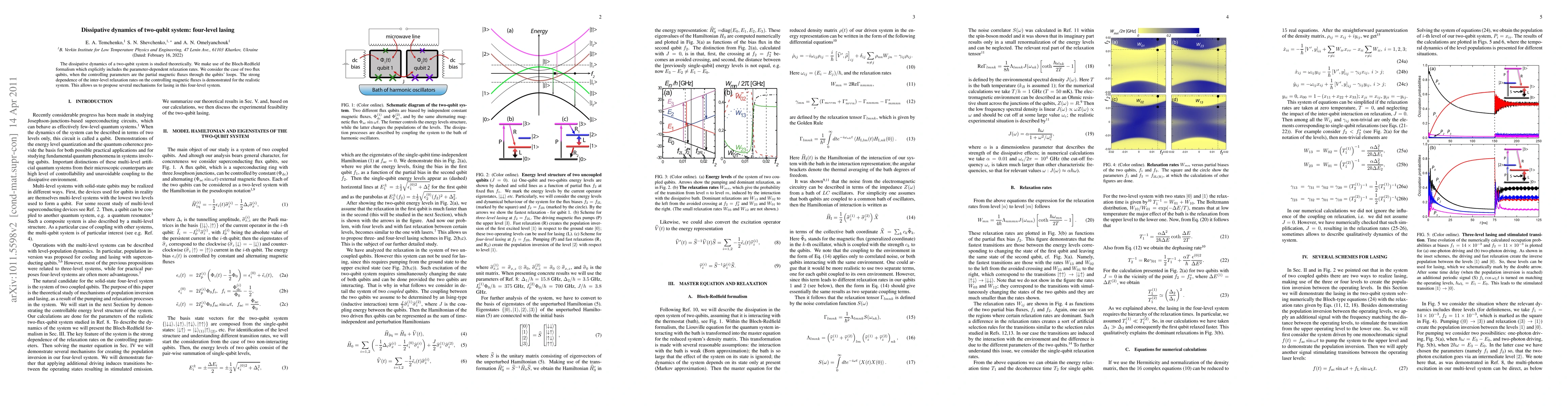 The paper explores the dissipative dynamics of a two-qubit system using the Bloch-Redfield formalism, demonstrating strong flux-dependent relaxation rates. It proposes mechanisms for lasing in this four-level system based on the control of magnetic fluxes through the qubits.