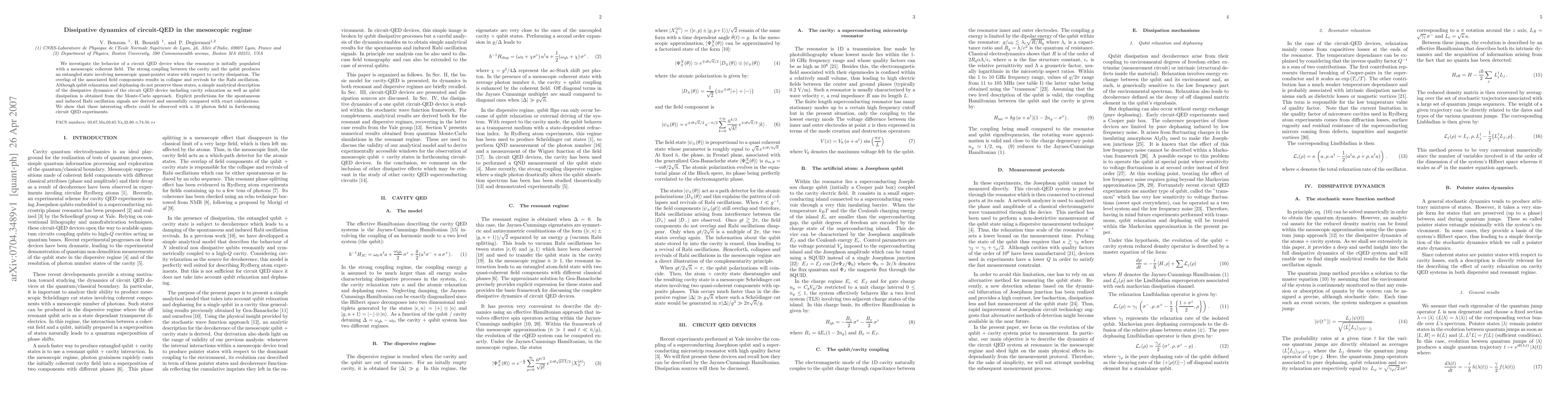 This paper explores the dynamics of a circuit QED system with a mesoscopic coherent field in the resonator, revealing entangled states and Rabi oscillation collapse and revivals due to cavity dissipation. Analytical models for the dissipative dynamics, including qubit and cavity relaxation, are derived and validated against exact calculations, predicting observable effects in future experiments with a 10-photon field.
