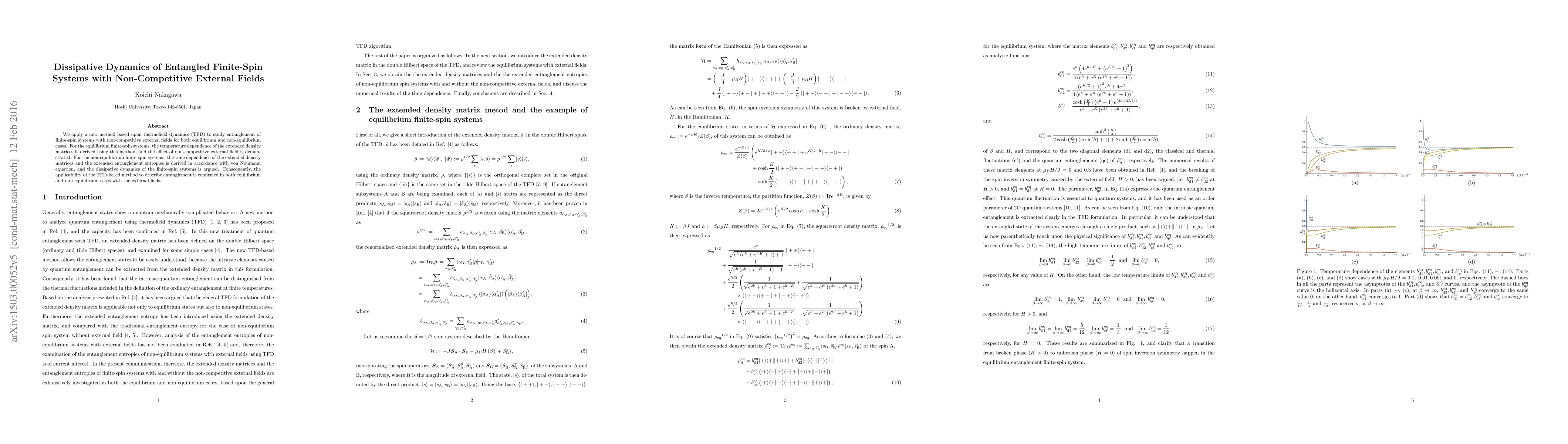 This paper employs thermofield dynamics (TFD) to investigate the entanglement in finite-spin systems under non-competitive external fields, deriving temperature and time dependencies of extended density matrices. The study confirms TFD's applicability to describe entanglement dynamics in both equilibrium and non-equilibrium scenarios.