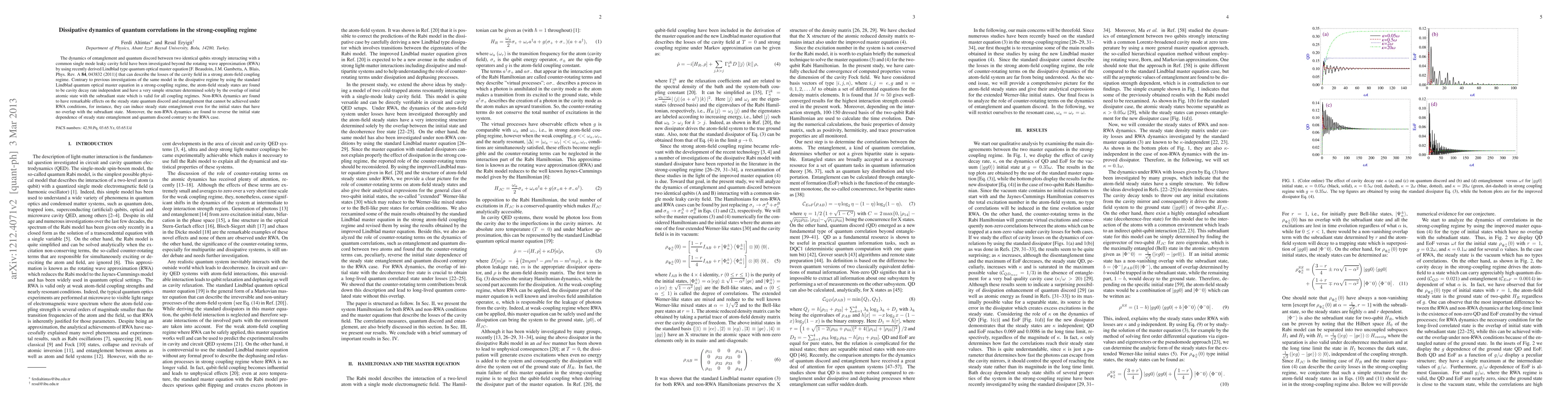 The dynamics of entanglement and quantum discord between two identical qubits strongly interacting with a common single mode leaky cavity field have been investigated beyond the rotating wave approximation (RWA) by using recently derived Lindblad type quantum optical master equation [F. Beaudoin, J.M. Gambetta, A. Blais, Phys. Rev. A {\bf 84}, 043832 (2011)] that can describe the losses of the cavity field in a strong atom-field coupling regime. Contrary to previous investigations of the same model in the dissipative regime by using the standard Lindblad quantum optical master equation in a strong-coupling regime, the atom-field steady states are found to be cavity decay rate independent and have a very simple structure determined solely by the overlap of initial atomic state with the subradiant state which is valid for all coupling regimes. Non-RWA dynamics are found to have remarkable effects on the steady state quantum discord and entanglement that cannot be achieved under RWA conditions, for instance, they can induce steady state entanglement even for the initial states that have no overlap with the subradiant state. Moreover, the non-RWA dynamics are found to reverse the initial state dependence of steady state entanglement and quantum discord contrary to the RWA case.