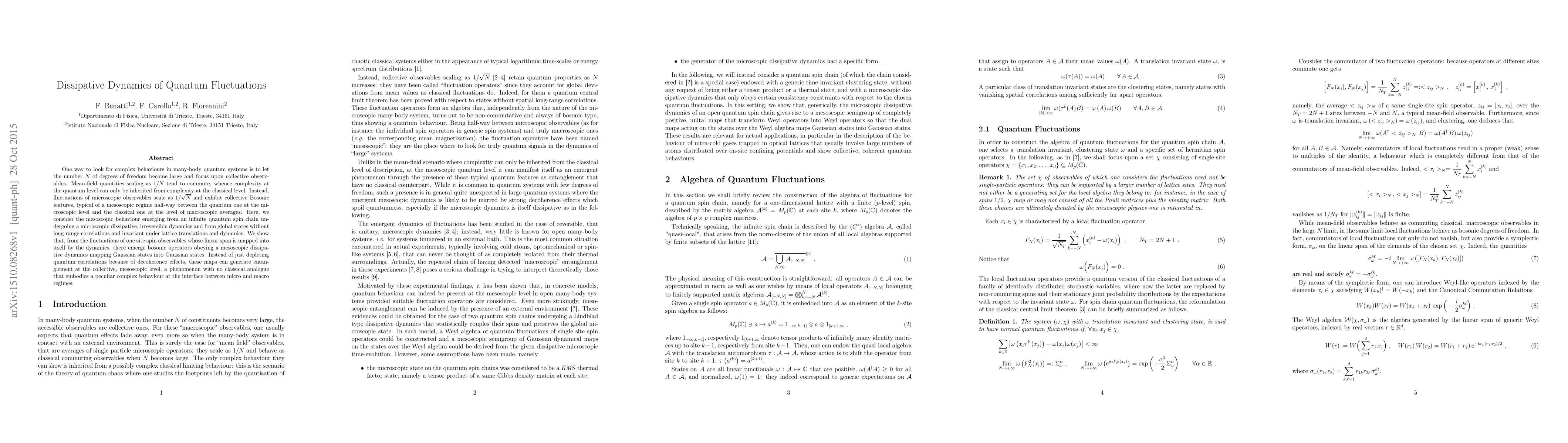 The research investigates the dissipative dynamics of quantum fluctuations in an infinite spin chain undergoing microscopic dissipative, irreversible dynamics. It focuses on the fluctuations of one-site spin observables and shows that bosonic operators emerge, obeying a mesoscopic dissipative dynamics that can generate entanglement at the collective, mesoscopic level.