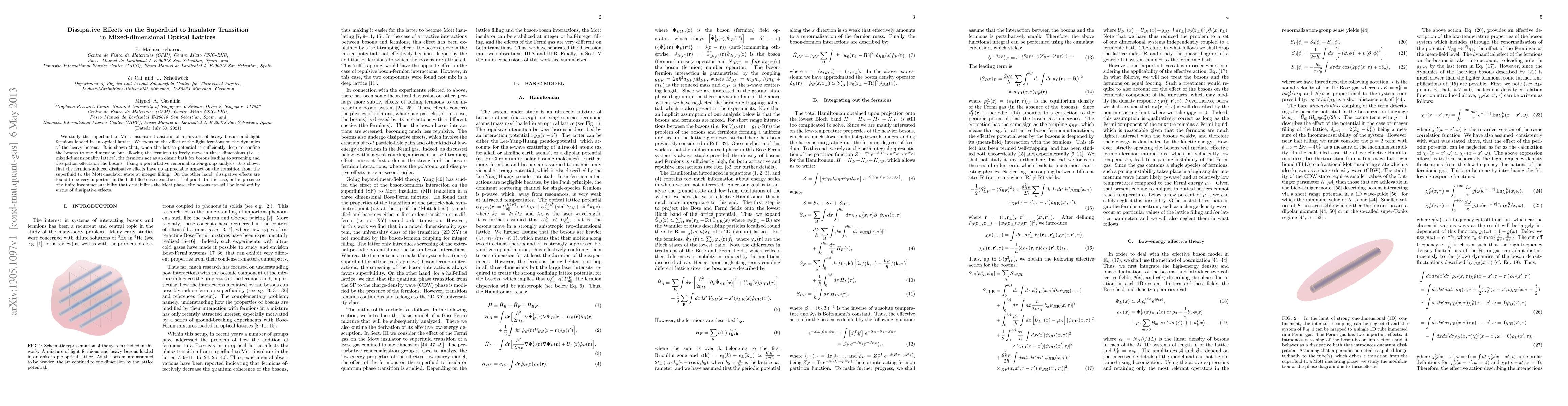 We study the superfluid to Mott insulator transition of a mixture of heavy bosons and light fermions loaded in an optical lattice. We focus on the effect of the light fermions on the dynamics of the heavy bosons. It is shown that, when the lattice potential is sufficiently deep to confine the bosons to one dimension but allowing the fermions to freely move in three dimensions (i.e. a mixed-dimensionality lattice), the fermions act as an ohmic bath for bosons leading to screening and dissipation effects on the bosons. Using a perturbative renormalization-group analysis, it is shown that the fermion-induced dissipative effects have no appreciable impact on the transition from the superfluid to the Mott-insulator state at integer filling. On the other hand, dissipative effects are found to be very important in the half-filled case near the critical point. In this case, in the presence of a finite incommensurability that destabilizes the Mott phase, the bosons can still be localized by virtue of dissipative effects.