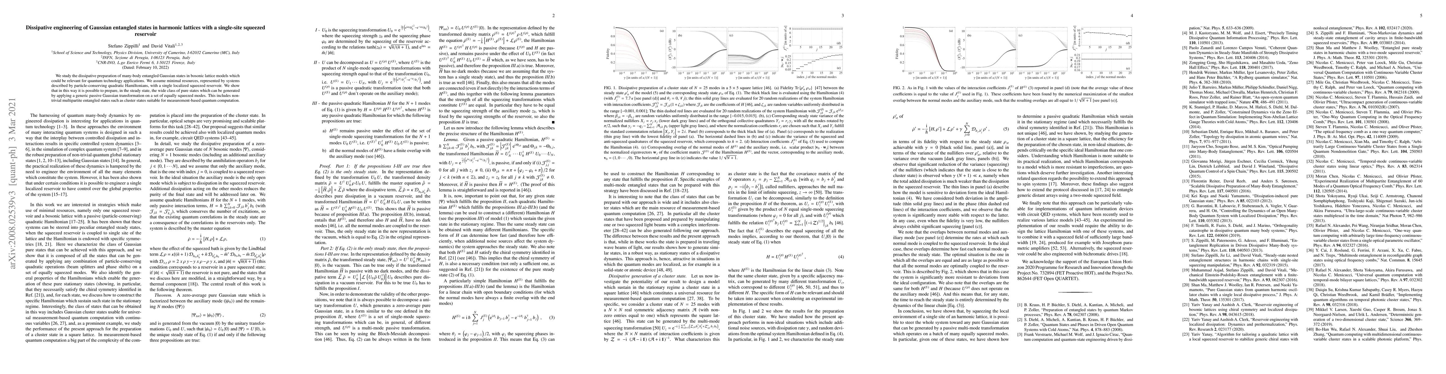 This paper explores the preparation of entangled Gaussian states using a single-site squeezed reservoir in harmonic lattices, demonstrating the ability to generate a wide range of pure states, including multipartite entangled cluster states, through passive Gaussian transformations. This method is resource-efficient and holds potential for quantum technology applications.