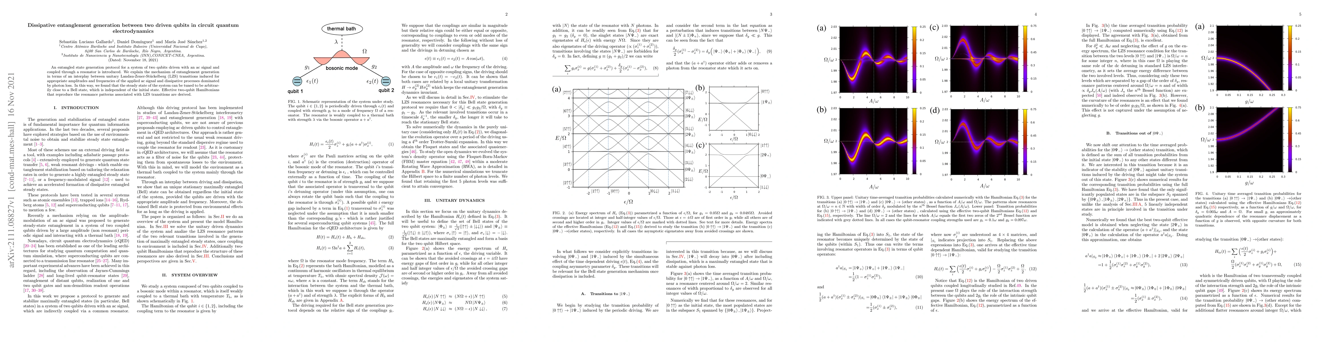 This paper introduces a protocol for generating entangled states between two driven qubits in a circuit quantum electrodynamics system, utilizing ac signals and a resonator. The entanglement arises from an interplay between unitary Landau-Zener-Stuckelberg transitions and dissipative photon loss, enabling the steady state to approach a Bell state regardless of the initial state.