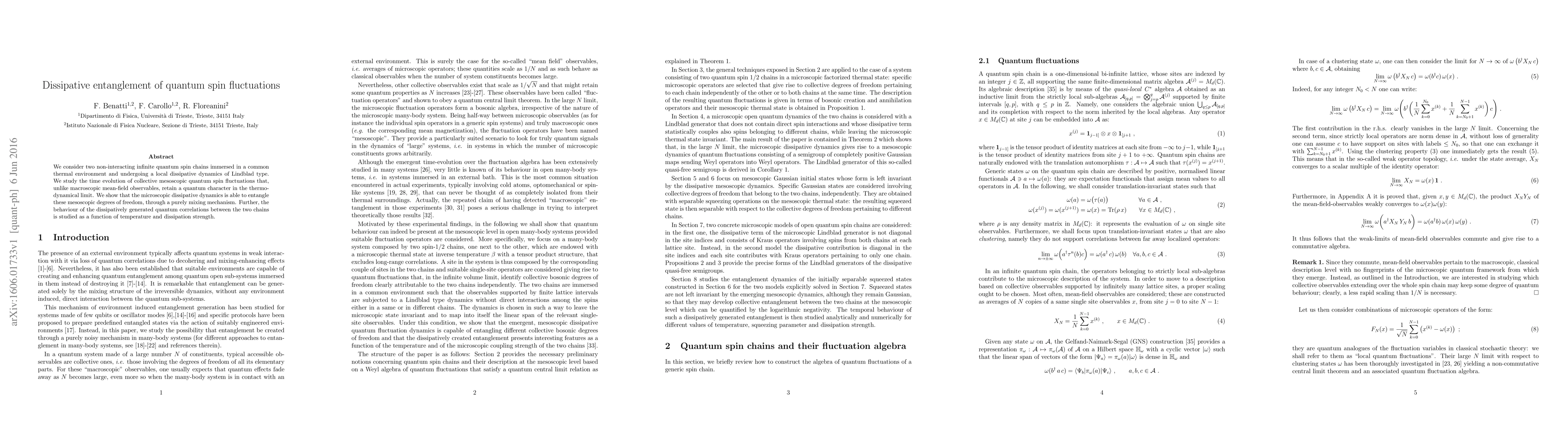 This paper investigates the entanglement of quantum spin fluctuations in two non-interacting infinite spin chains subjected to local dissipative dynamics. It demonstrates that the dissipative process can entangle these mesoscopic quantum degrees of freedom through a purely mixing mechanism, and examines how these quantum correlations vary with temperature and dissipation strength.