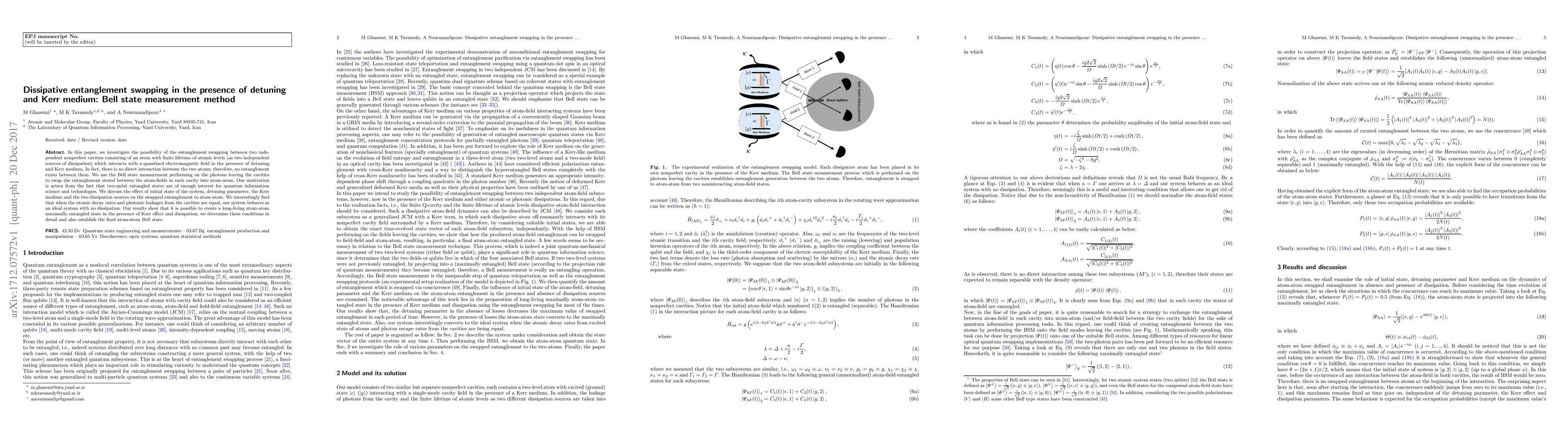 Researchers investigate entanglement swapping between two independent cavities with finite lifetime, detuning, and Kerr medium, successfully creating a long-living atom-atom maximally entangled state.