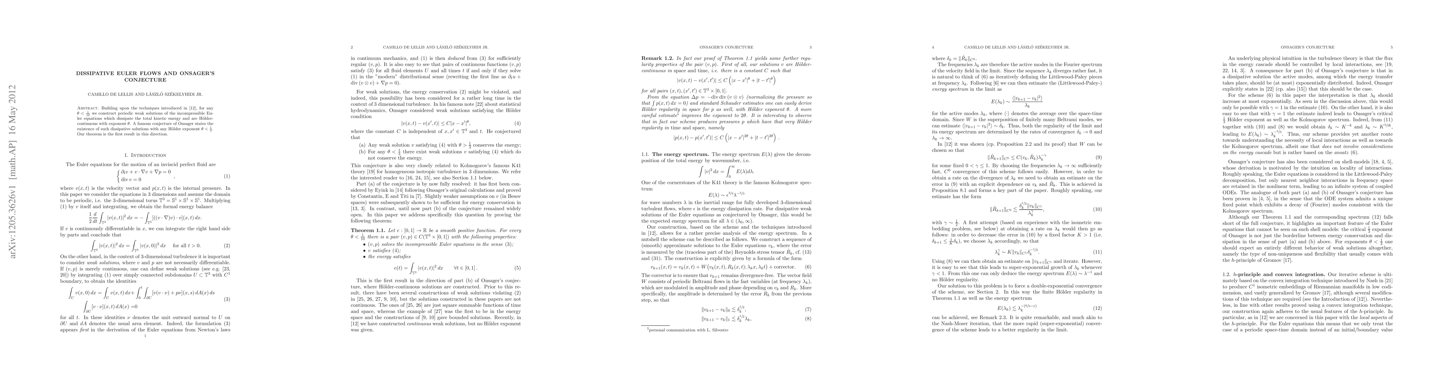 This paper constructs periodic weak solutions of the incompressible Euler equations that dissipate total kinetic energy and exhibit H\"older continuity with exponent \theta<1/10. It provides the first result supporting Onsager's conjecture regarding the existence of dissipative solutions for any \theta<1/3.
