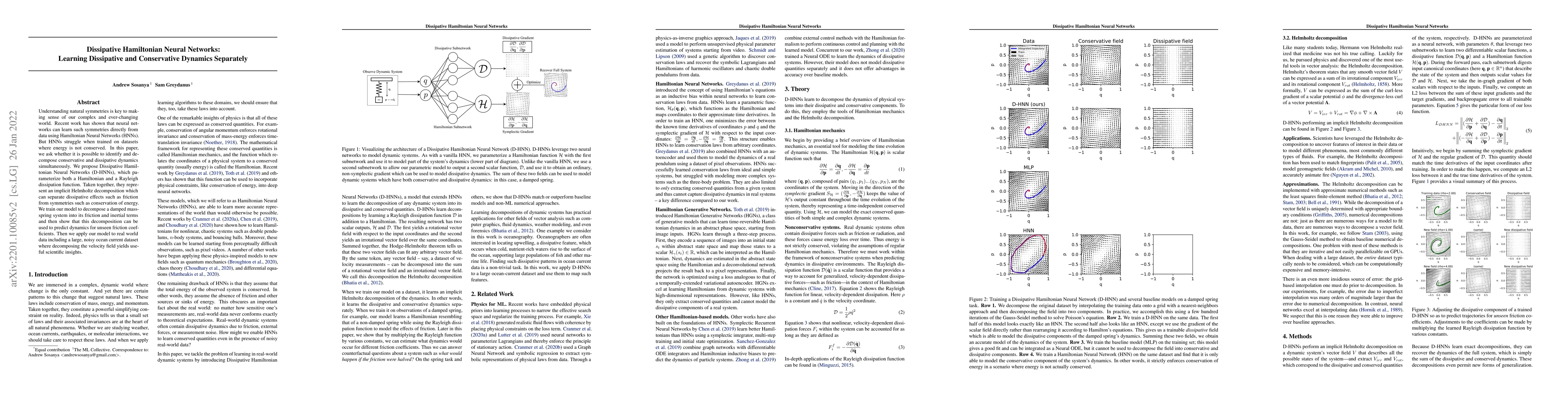 This paper proposes Dissipative Hamiltonian Neural Networks (D-HNNs) to separately learn both conservative and dissipative dynamics. The model decomposes a system into its Hamiltonian and Rayleigh dissipation components, enabling the prediction of dynamics under unseen conditions and providing insights from real-world data like ocean currents.