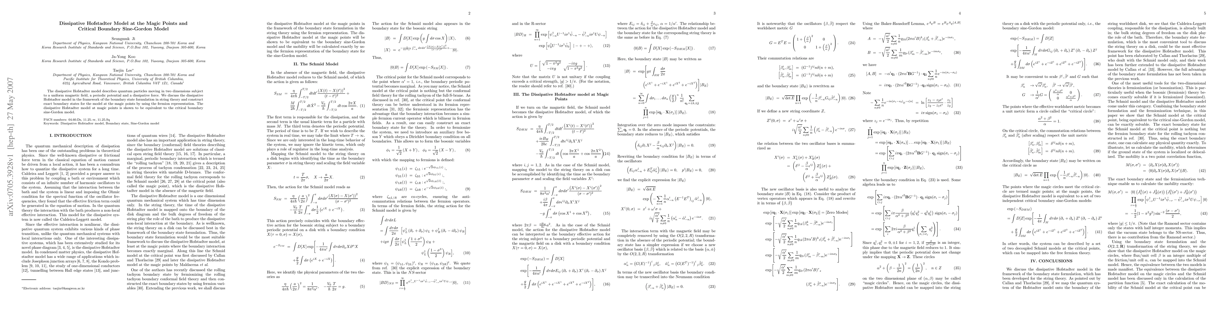 The dissipative Hofstadter model, involving quantum particles in a magnetic field and periodic potential with dissipation, is analyzed using string theory's boundary state formulation. The model is shown to be equivalent to the critical boundary sine-Gordon model at magic points.