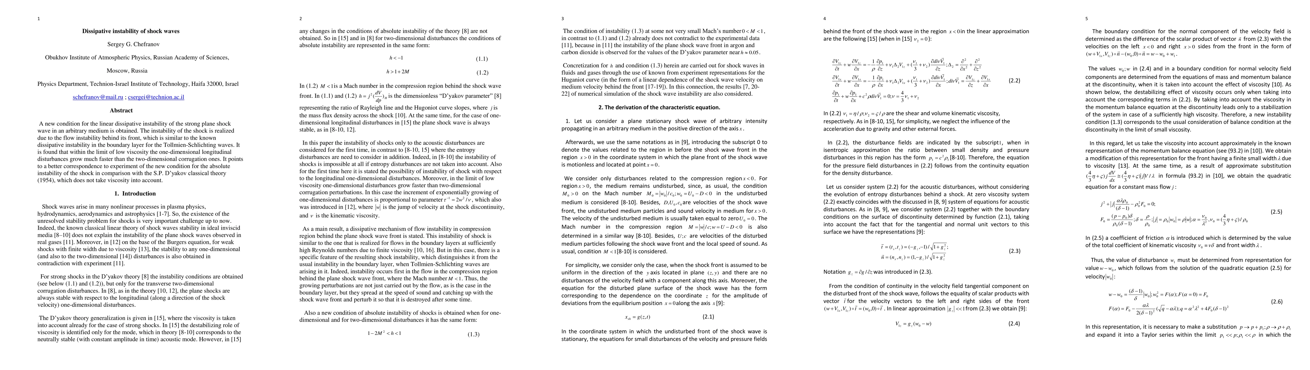 This paper presents a new condition for the linear dissipative instability of strong plane shock waves in various media, showing that instability is driven by flow instability behind the shock front. Low viscosity favors the growth of one-dimensional disturbances over two-dimensional corrugations, aligning better with experimental observations of absolute instability than traditional theory.